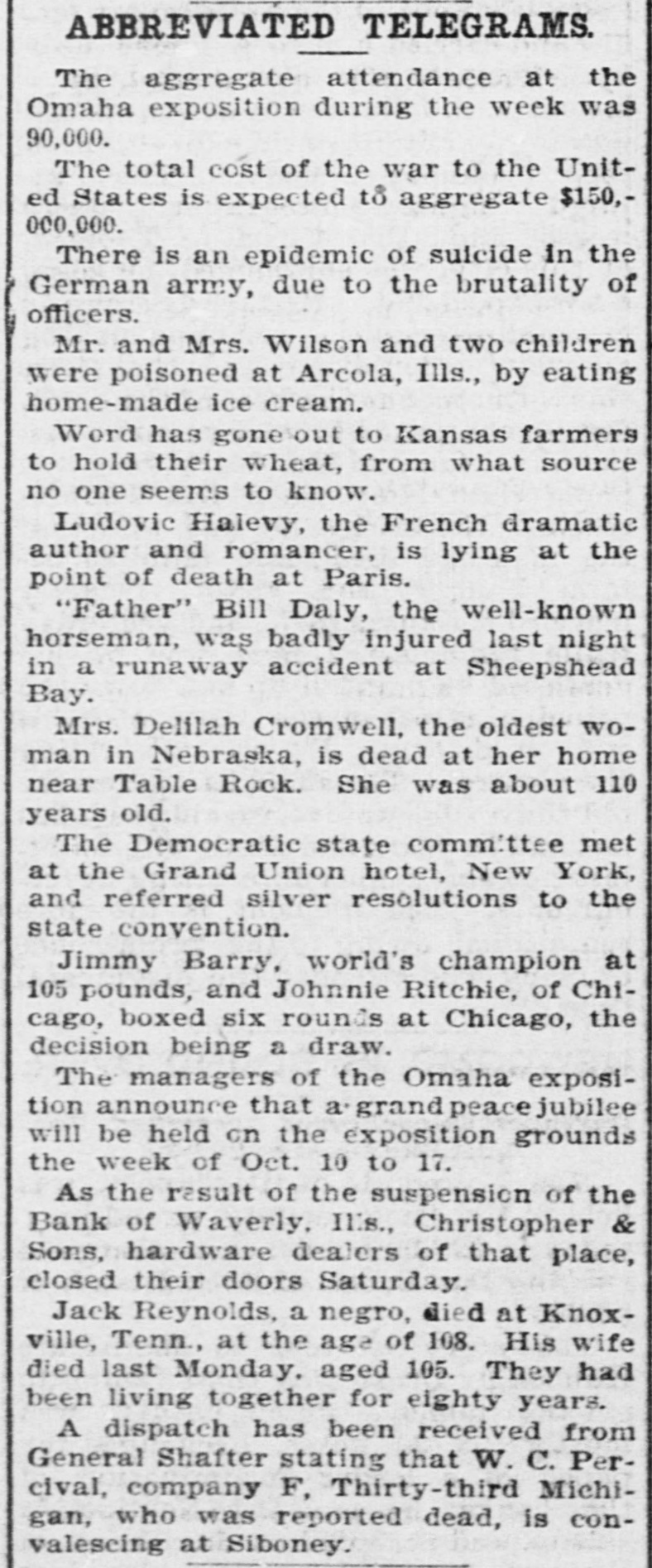ABBREVIATED TELEGRAMS. The aggregate attendance at the Omaha exposition during the week was 90,000. The total cost of the war to the United States is expected to aggregate $150,000,000. There is an epidemic of suicide in the German army, due to the brutality of officers. Mr. and Mrs. Wilson and two children were poisoned at Arcola, Ills., by eating home-made ice cream. Word has gone out to Kansas farmers to hold their wheat, from what source no one seems to know. Ludovic Halevy, the French dramatic author and romancer, is lying at the point of death at Paris. "Father" Bill Daly, the well-known horseman, was badly injured last night in a runaway accident at Sheepshead Bay. Mrs. Delilah Cromwell, the oldest woman in Nebraska, is dead at her home near Table Rock. She was about 110 years old. The Democratic state committee met at the Grand Union hotel, New York, and referred silver resolutions to the state convention. Jimmy Barry, world's champion at 105 pounds, and Johnnie Ritchie, of Chicago, boxed six rounds at Chicago, the decision being a draw. The managers of the Omaha exposition announce that a. grand peace jubilee will be held on the exposition grounds the week of Oct. 10 to 17. As the result of the suspension of the Bank of Waverly, Il's., Christopher & Sons, hardware dealers of that place, closed their doors Saturday. Jack Reynolds, a negro, died at Knoxville, Tenn., at the age of 108. His wife died last Monday. aged 105. They had been living together for eighty years. A dispatch has been received from General Shafter stating that W. C. Percival, company F, Thirty-third Michigan, who was reported dead, is convalescing at Siboney.