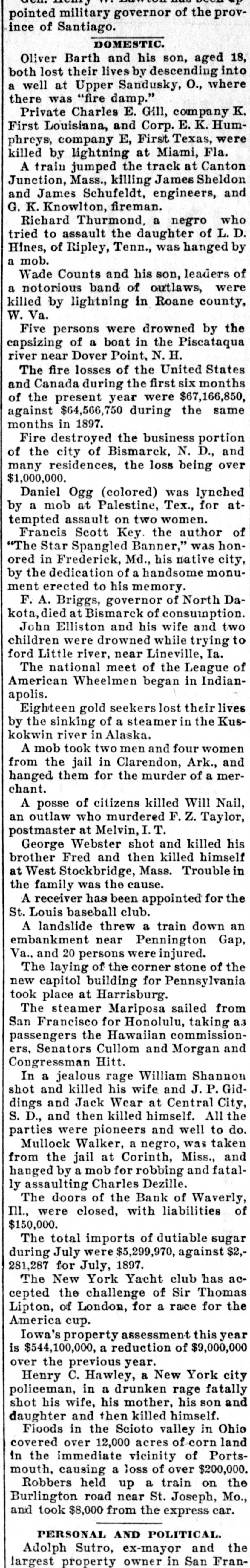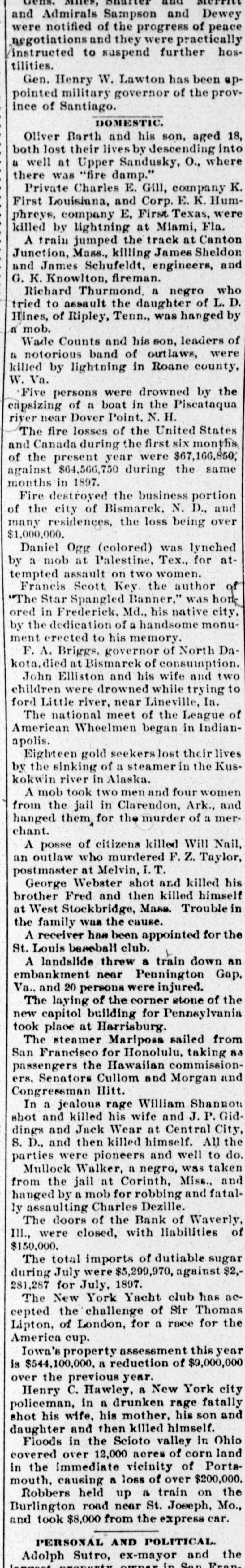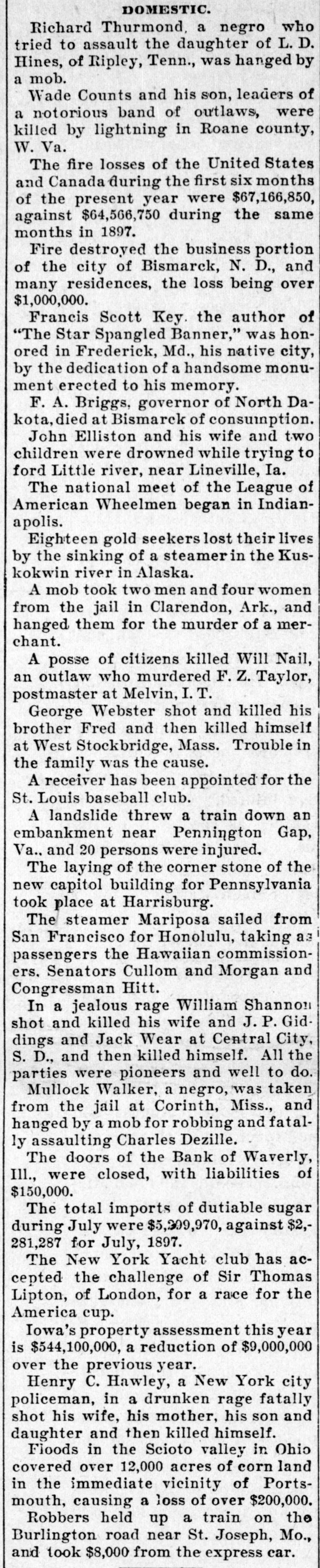 DOMESTIC. Richard Thurmond, a negro who tried to assault the daughter of L.D. Hines, of Ripley, Tenn., was hanged by a mob. Wade Counts and his son, leaders of a notorious band of outlaws, were killed by lightning in Roane county, W. Va. The fire losses of the United States and Canada during the first six months of the present year were $67,166,850, against $64,566,750 during the same months in 1897. Fire destroyed the business portion of the city of Bismarck, N. D., and many residences, the loss being over $1,000,000. Francis Scott Key. the author of "The Star Spangled Banner," was honored in Frederick, Md., his native city, by the dedication of a handsome monument erected to his memory. F. A. Briggs, governor of North Dakota, died at Bismarck of consumption. John Elliston and his wife and two children were drowned while trying to ford Little river, near Lineville, Ia. The national meet of the League of American Wheelmen began in Indianapolis. Eighteen gold seekers lost their lives by the sinking of a steamer in the Kuskokwin river in Alaska. A mob took two men and four women from the jail in Clarendon, Ark., and hanged them for the murder of a merchant. A posse of citizens killed Will Nail, an outlaw who murdered F. Z. Taylor, postmaster at Melvin, I.T. George Webster shot and killed his brother Fred and then killed himself at West Stockbridge, Mass. Trouble in the family was the cause. A receiver has been appointed for the St. Louis baseball club. A landslide threw a train down an embankment near Pennington Gap, Va.. and 20 persons were injured. The laying of the corner stone of the new capitol building for Pennsylvania took place at Harrisburg. The steamer Mariposa sailed from San Francisco for Honolulu, taking as passengers the Hawaiian commissioners. Senators Cullom and Morgan and Congressman Hitt. In a jealous rage William Shannon shot and killed his wife and J.P. Giddings and Jack Wear at Central City, S. D., and then killed himself. All the parties were pioneers and well to do. Mullock Walker, a negro, was taken from the jail at Corinth, Miss., and hanged by a mob for robbing and fatally assaulting Charles Dezille. The doors of the Bank of Waverly, III., were closed, with liabilities of $150,000. The total imports of dutiable sugar during July were $5,399,970, against $2,281,287 for July, 1897. The New York Yacht club has accepted the challenge of Sir Thomas Lipton, of London, for a race for the America cup. Iowa's property assessment this year is $544,100,000, a reduction of $9,000,000 over the previous year. Henry C. Hawley, a New York city policeman, in a drunken rage fatally shot his wife, his mother, his son and daughter and then killed himself. Floods in the Scioto valley in Ohio covered over 12,000 acres of corn land in the immediate vicinity of Portsmouth, causing a loss of over $200,000. Robbers held up a train on the Burlington road near St. Joseph, Mo., and took $8,000 from the express car.