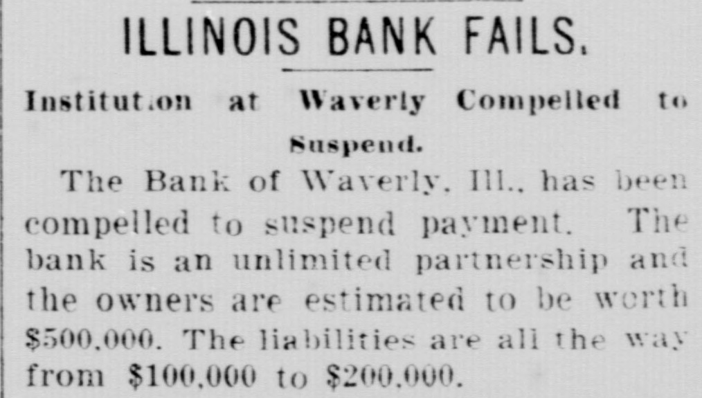 ILLINOIS BANK FAILS. Institution at Waverly Compelled to Suspend. The Bank of Waverly, III.. has been compelled to suspend payment. The bank is an unlimited partnership and the owners are estimated to be worth $500,000. The liabilities are all the way from $100,000 to $200,000.