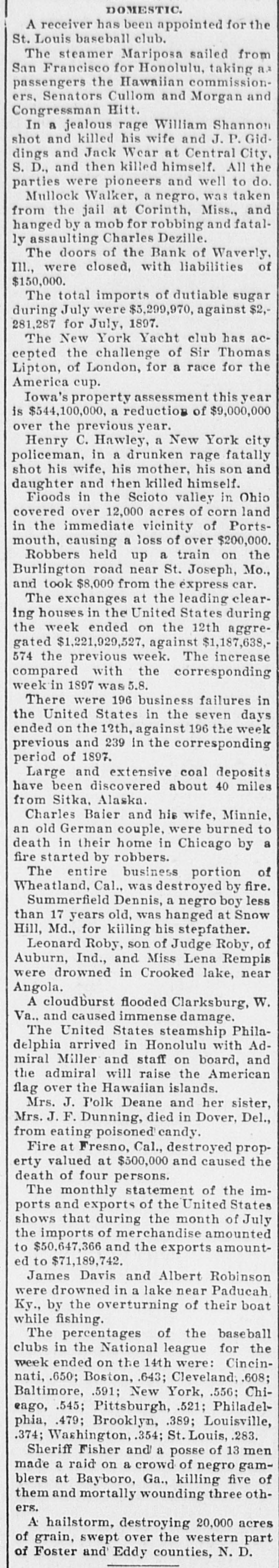 DOMESTIC. A receiver has been appointed for the St. Louis baseball club. The steamer Mariposa sailed from San Francisco for Honolulu, taking as passengers the Hawniian commissioners. Senators Cullom and Morgan and Congressman Hitt. In a jealous rage William Shannon shot and killed his wife and J. P.Gid dings and Jack Wear at Central City, S.D., and then killed himself. All the parties were do. a was Mullock Walker, pioneers negro, and well to taken from the jail at Corinth, Miss., and hanged by a mob for robbing and fatally assaulting Charles Dezille. The doors of the Bank of Waverly, Ill., were closed, with liabilities of $150,000. The total imports of dutiable sugar during July were $5,299,970, against $2,281,287 for July, 1897. The New York Yacht club has accepted the challenge of Sir Thomas Lipton, of London, for a race for the America cup. Iowa's property assessment this year is $544,100,000, a reduction of $9,000,000 over the previous year. Henry C. Hawley, a New York city policeman, in a drunken rage fatally shot his wife, his mother, his son and daughter and then killed himself. Floods in the Scioto valley in Ohio covered over 12,000 acres of corn land in the immediate vicinity of Portsmouth, causing a loss of over $200,000. Robbers held up a train on the Burlington road near St. Joseph, Mo., and took $8,000 from the express car. The exchanges at the leading clearing houses in the United States during the week ended on the 12th aggregated $1,221,929,527. against $1,187,638, 574 the previous week. The increase compared with the corresponding week in 1897 was 5.8. There were 196 business failures in the United States in the seven days ended on the 12th, against 196 the week previous and 239 in the corresponding period of 1897. Large and extensive coal deposits have been discovered about 40 miles from Sitka, Alaska. Charles Baier and his wife, Minnie, an old German couple, were burned to death in their home in Chicago by a fire started by robbers. The entire business portion of Wheatland, Cal., was destroyed by fire. Summerfield Dennis, a negro boy less than 17 years old, was hanged at Snow Hill, Md., for killing his stepfather. Leonard Roby, son of Judge Roby, of Auburn, Ind., and Miss Lena Rempis were drowned in Crooked lake, near Angola. A cloudburst flooded Clarksburg, W. Va. and caused immense damage. The United States steamship Philadelphia arrived in Honolulu with Admiral Miller and staff on board, and the admiral will raise the American flag over the Hawaiian islands. Mrs. J. Polk Deane and her sister, Mrs. J. F. Dunning, died in Dover, Del., from eating poisoned candy. Fire at Fresno, Cal., destroyed property valued at $500,000 and caused the death of four persons. The monthly statement of the imports and exports of the United States shows that during the month of July the imports of merchandise amounted to $50,647,366 and the exports amounted to $71,189,742. James Davis and Albert Robinson were drowned in a lake near Paducah Ky., by the overturning of their boat while fishing. The percentages of the baseball clubs in the National league for the week ended on the 14th were: Cincinnati, .650; Boston, .643; Cleveland,608; Baltimore, .591; New York, .556: Chieago, .545; Pittsburgh, .521; Philadelphia, .479; Brooklyn, .389; Louisville, .374; Washington, 354; St. Louis, .283. Sheriff Fisher and a posse of 13 men made a raid on a crowd of negro gamblers at Bayboro, Ga., killing five of them and mortally wounding three others. A hailstorm, destroying 20,000 acres of grain, swept over the western part of Foster and Eddy counties, N.