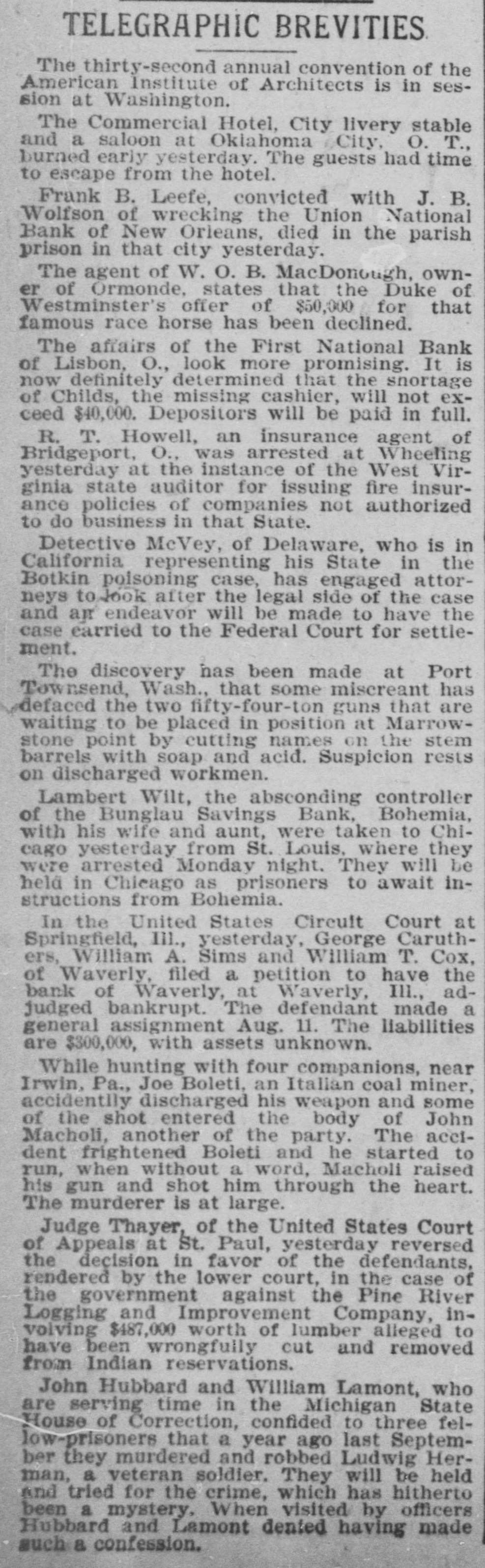 TELEGRAPHIC BREVITIES. The thirty-second annual convention of the American Institute of Architects is in session at Washington. The Commercial Hotel, City livery stable and a saloon at Oklahoma City, O. T., burned early yesterday. The guests had time to escape from the hotel. Frank B. Leefe, convicted with J. B. Wolfson of wrecking the Union National Bank of New Orleans, died in the parish prison in that city yesterday. The agent of W. O. B. MacDonough, owner of Ormonde, states that the Duke of Westminster's offer of $50,000 for that famous race horse has been declined. The affairs of the First National Bank of Lisbon, O., look more promising. It is now definitely determined that the snortage of Childs, the missing cashier, will not exceed $40,000. Depositors will be paid in full. R. T. Howell, an insurance agent of Bridgeport, O., was arrested at Wheeling yesterday at the instance of the West Virginia state auditor for issuing fire insurance policies of companies not authorized to do business in that State. Detective McVey, of Delaware, who is in California representing his State in the Botkin poisoning case, has engaged attorneys to look after the legal side of the case and an endeavor will be made to have the case carried to the Federal Court for settlement. The discovery has been made at Port Townsend, Wash., that some miscreant has defaced the two fifty-four-ton guns that are waiting to be placed in position at Marrowstone point by cutting names on the stem barrels with soap and acid. Suspicion rests on discharged workmen. Lambert Wilt, the absconding controller of the Bunglau Savings Bank, Bohemia, with his wife and aunt, were taken to Chicago yesterday from St. Louis, where they were arrested Monday night. They will be held in Chicago as prisoners to await instructions from Bohemia. In the United States Circuit Court at Springfield, III., yesterday, George Caruthers, William A. Sims and William T. Cox. of Waverly, filed a petition to have the bank of Waverly, at Waverly, III., adjudged bankrupt. The defendant made a general assignment Aug. 11. The liabilities are $300,000, with assets unknown. While hunting with four companions, near Irwin, Pa., Joe Boleti, an Italian coal miner, accidently discharged his weapon and some of the shot entered the body of John Macholi, another of the party. The accident frightened Boleti and he started to run, when without a word, Macholi raised his gun and shot him through the heart. The murderer is at large. Judge Thayer, of the United States Court of Appeals at St. Paul, yesterday reversed the decision in favor of the defendants, rendered by the lower court, in the case of the government against the Pine River Logging and Improvement Company, involving $487,000 worth of lumber alleged to have been wrongfully cut and removed from Indian reservations. John Hubbard and William Lamont, who are serving time in the Michigan State House of Correction, confided to three fellow-prisoners that a year ago last September they murdered and robbed Ludwig Herman, a veteran soldier, They will be held and tried for the crime, which has hitherto been a mystery, When visited by officers Hubbard and Lamont dented having made such a confession.