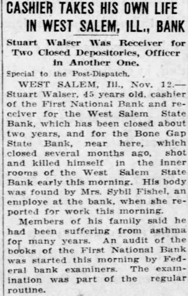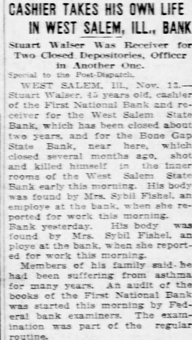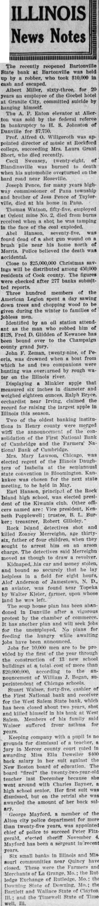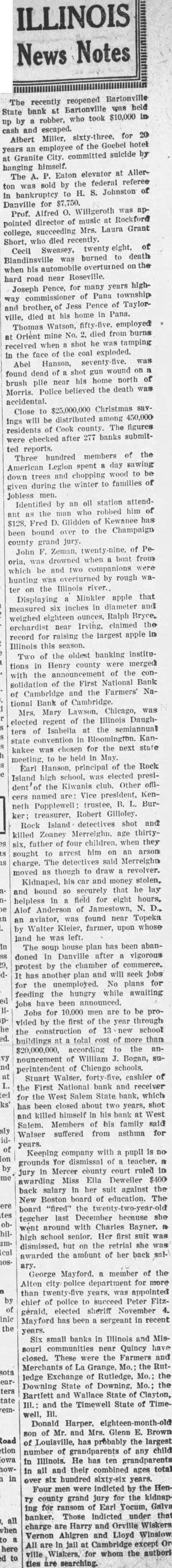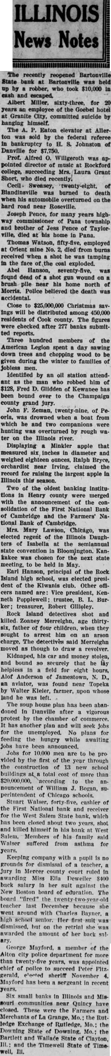 ILLINOIS recently reopened State bank Bartonville was held by robber, took $10,000 and escaped. Albert Miller, for years employee of the Goebel hotel Granite City, committed suicide himself. The Eaton elevator at Allerton was sold by the federal referee bankruptcy Johnston Danville for Prof. Alfred Willgeroth appointed director of music at Rockford college, succeeding Laura Grant Short, who died recently. Blandinsville was burned to death when his automobile overturned the hard road near Joseph Pence, for many years highPana township and brother of Pence of Taylorville, died at his home in Pana. Thomas Watson, employed Orient mine died from burns received when shot he tamping the face coal exploded. Abel Hanson, was found dead of shot wound brush pile near his home north Morris. Police believed the death was accidental. Close to $25,000,000 Christmas savIngs will distributed among 450,000 residents of Cook county. The figures checked after 277 banks submitted reports. Three hundred members of the American Legion spent day sawing down trees and chopping wood to given during the winter to of Jobless men. Identified by an oil station attendant the man who robbed him of Fred Glidden Kewanee has been bound over to the Champaign county grand jury. John Zeman, of Peoria, was drowned when boat from which he and two companions were hunting was overturned by rough ter on the Illinois river. Displaying Minkler apple that measured Inches in diameter and weighed eighteen ounces, Ralph Bryce, orchardist near Irving, claimed the record for raising the largest apple in Illinois this season. Two of the oldest banking Institutions in Henry county were merged with the announcement of the consolidation of the First National Bank of Cambridge and the Farmers' National Bank Cambridge. Mrs. Mary Lawson, Chicago, elected regent of the Illinois Daughters of Isabella at the semiannual state convention in Bloomington. Kankakee was chosen for the next state meeting, to be held May. Earl Hanson, principal the Rock Island high school, was elected president of the Kiwanis club. Other officers named Vice president, Kenneth Popplewell; trustee, Burtreasurer, Robert Gilloley. Rock Island detectives shot and killed Zoaney Merreighn, age thirtysix, father four children, when they sought to arrest him on an arson charge. The detectives said Merreighn moved as though to draw revolver. Kidnaped, his car and money stolen, and bound securely that helpless field for eight hours, Alof Anderson of Jamestown, aviator, was found near Topeka by Walter Kleler, farmer, upon whose land he was left. house plan has been abandoned in Danville after vigorous protest by the chamber of commerce. has another plan and will seek Jobs for the unemployed. No plans for feeding the hungry while awaiting Jobs have been announced. Jobs for 10,000 men are to be pro vided by the first the year through the of 13 new school buildings total cost of more than $20,000,000, according to the nouncement of William Bogan, superintendent of Chicago schools. Stuart Walser, cashier of the First National bank and receiver for the West Salem State bank, which has been closed about two years, shot and killed himself In his bank West Salem. Members his family said Walser suffered from asthma for years. Keeping company with pupil grounds for dismissal of teacher, in Mercer county court ruled In awarding Miss Ella Deweiler $400 back salary in her suit against the New Boston board of education. The board "fired" teacher last December because went around with Charles Bayner, high school senior. Her dismissed. but on the retrial she awarded the amount of her back ary.