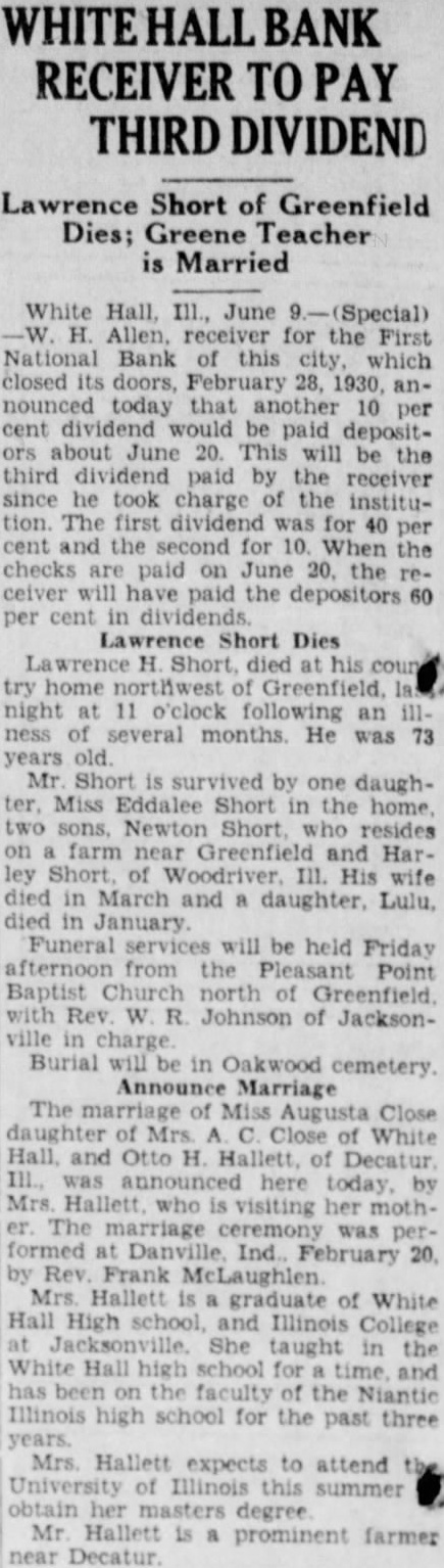 RECEIVER TO PAY DIVIDEND Lawrence Short of Greenfield Dies; Greene Teacher is Married White Hall, Ill., June Allen. for First National Bank this which closed doors, antoday that another per cent be paid depositabout 20. This will be the third paid by the receiver since he took charge the institution. The first dividend per for 10. When the checks paid on June 20, the ceiver will paid the depositors 60 per cent dividends. Short Dies Short, died home Greenfield. night 11 an several months. He was 73 years Short survived by one daughMiss Eddalee Short in the home. Newton Short, resides farm near and Harley Short, of His wife died in March and daughter, Lulu, died in January. Funeral services will held Friday afternoon from Pleasant Point Baptist Church north Greenfield. Johnson of Jacksonville charge. Burial will in Oakwood cemetery. Announce Marriage The Miss Augusta Close Mrs. Close White and Otto H. Hallett, Decatur here today, by visiting her mothwas Ind., February 20. Frank McLaughlen. Mrs. Hallett of White Hall High Illinois College She taught in the Hall school faculty the Illinois high school for the past three Mrs. Hallett expects to attend Illinois summer obtain Hallett prominent farmer Decatur.
