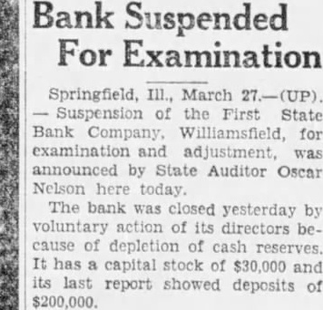 Bank For Examination Springfield, Ill., March 27.-(UP). Suspension of the First State Bank Company, Williamsfield, for examination and adjustment, was announced by State Auditor Oscar Nelson here today. The bank was closed yesterday by voluntary action of its directors because of depletion of cash reserves. It has a capital stock of $30,000 and its last report showed deposits of $200,000.