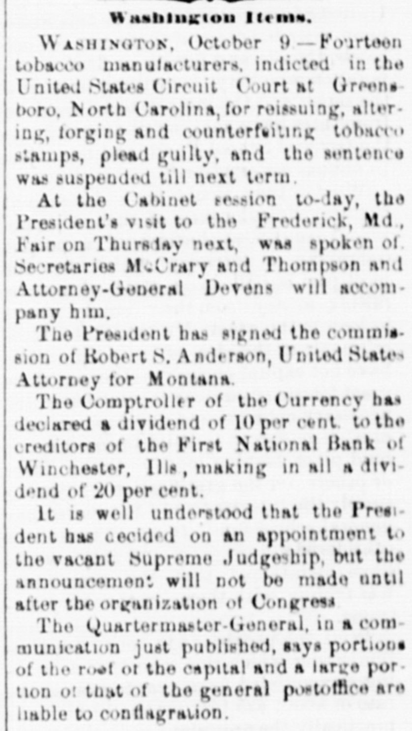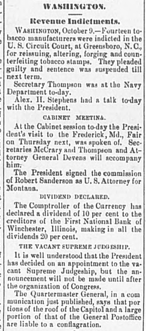 1 WASHINGTON. Revenue Indictments. / WASHINGTON, October 0.-Fourteen to. bacco manufacturers were indicted in the 3 U. S. Circuit Court, at Greensboro, N.C., for reissuing, altering, forging and conne terfeiting tobacco stamps. They pleaded guilty and sentence was suspended till next term. 1 Secretary Thompson was at the Navy Department to-day. ) Alex. II. Stephens had a talk today with the President. CABINET MEETIN&. At the Cabinet session to-day the Presito on was dent's Thursday visit next, the Frederick, spoken Md., of. Fair Sec. retaries McCrary and Thompson and Attorney General Devens will accompany him. The President signed the commission of Robert Sanderson as U.S. Attorney for Montana. DIVIDEND DECLARED. The Comptroller of the Currency has declared a dividend of 10 per cent to the creditors of the First National Bank of , Winchester, Illinois, making in all the dividends 20 per cent. THE VACANT SUPREME JUDGESHIP. f It is well understood that the President has decided on an appointment to the V2cant Supreme Judgeship, but the an: nouncement will not be made until after ) the organization of Congress. The Quartermaster General, in a com munication just published, says that por tions of the roof of the Capitol and a large portion of that of the General Postoffice are liable to a conflagration.