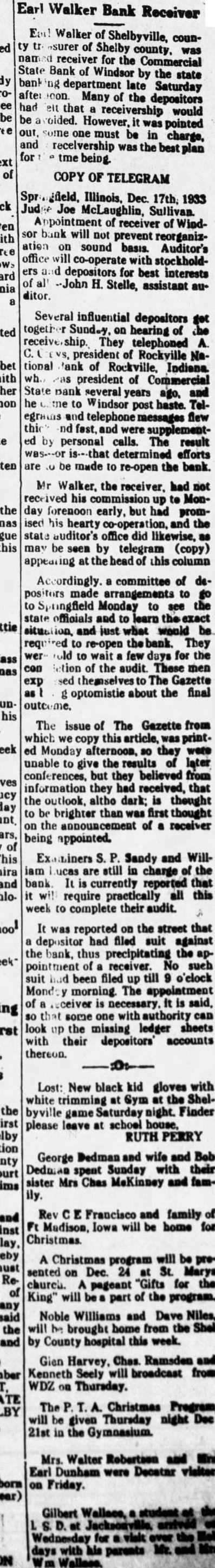 Earl Walker Bank Receiver Earl Walker of Shelbyville, county of Shelby county, was receiver for the Commercial State Bank of Windsor by the state department late Saturday after 100n. Many of the depositors had eit that receivership would be oided. However, it was pointed out, some one must be in charge, and receivership was the best plan for being. COPY OF TELEGRAM Illinois, Dec. 17th, 1933 Judge Joe McLaughlin, Sullivan. Appointment of receiver of Windsor bank will not prevent reorganization on sound basis. Auditor's office will co-operate with stockholdand depositors for best interests of all -John H. Stelle, assistant auditor. Several influential depositors togeth Sundey, on hearing of They telephoned A. president of Rockville National Bank of Rockville, Indiana. wh., was president of Commercial State bank several years ago, he to Windsor post haste. Telegrams and telephone messages flew thic fest, and were supplemented by personal calls. The result determined efforts are be made to re-open the bank. Mr Walker, the receiver. had not received his commission up to Monday forenoon early, but had promised his hearty co-operation, and the state auditor's office did likewise, as may be seen by telegram (copy) appearing at the head of this column Accordingly. a committee of depositors made arrangements to to Springfield Monday to see the state officials and to learn the situation, and just what would be. required to re-open the bank. They wer to wait a few days for the con letion of the audit. These men exp sed themselves to The Gazette g optomistie about the final outcome. The issue of The Gazette from which copy this article, was print. ed Monday afternoon, so they were unable to give the results of later conferences, but they believed from information they had received, that the outlook, altho dark: is thought to be brighter than was first thought on the announcement of a receiver being appointed. Examiners Sandy and William lucas are still in charge of the bank It is currently reported that it will require practically all this week to complete their audit. It was reported on the street that a depositor had filed suit against the bank, thus precipitating the appointment of receiver. No such suit had been filed up till 9 o'elock Monday morning. The appointment of a receiver is necessary. it is said, so that some one with authority can look up the missing ledger sheets with their depositors accounts thereon. Lost: New black kid gloves with white trimming at Gym at the Shelbyville game Saturday night. Finder please leave at school house. RUTH PERRY George Dedman and wife and Beb Dedman spent Sunday with their sister Mrs Chas MeKinney and family. Rev Francisco and family of Ft Mudison, Iowa will be home for Christmas. A Christmas program will be presented on Dec. 24 at St. Marys church. A pageant "Gifts for the King" will be part of the program. Noble Williams and Dave Niles, will be brought home from the Shell by County hospital this week. Gien Harvey, Chas. Ramsden and Kenneth Seely will broadcast from WDZ on Thursday. Christmas will be given Thursday night Dec 21st in the Gymnasium. Mrs. Walter Robertson and Earl Dunham were Decatar on Friday. Gilbert Wallace, Jacksonville, Wednesday for days with his