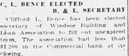 C. L. BENCE ELECTED B. & L. SECRETARY Clifford 1., Bence has been elected secretary of Windsor Building and Dian Association to fill out unexpired term. The association had less than $1.200 in the Commercial bank at its closing.