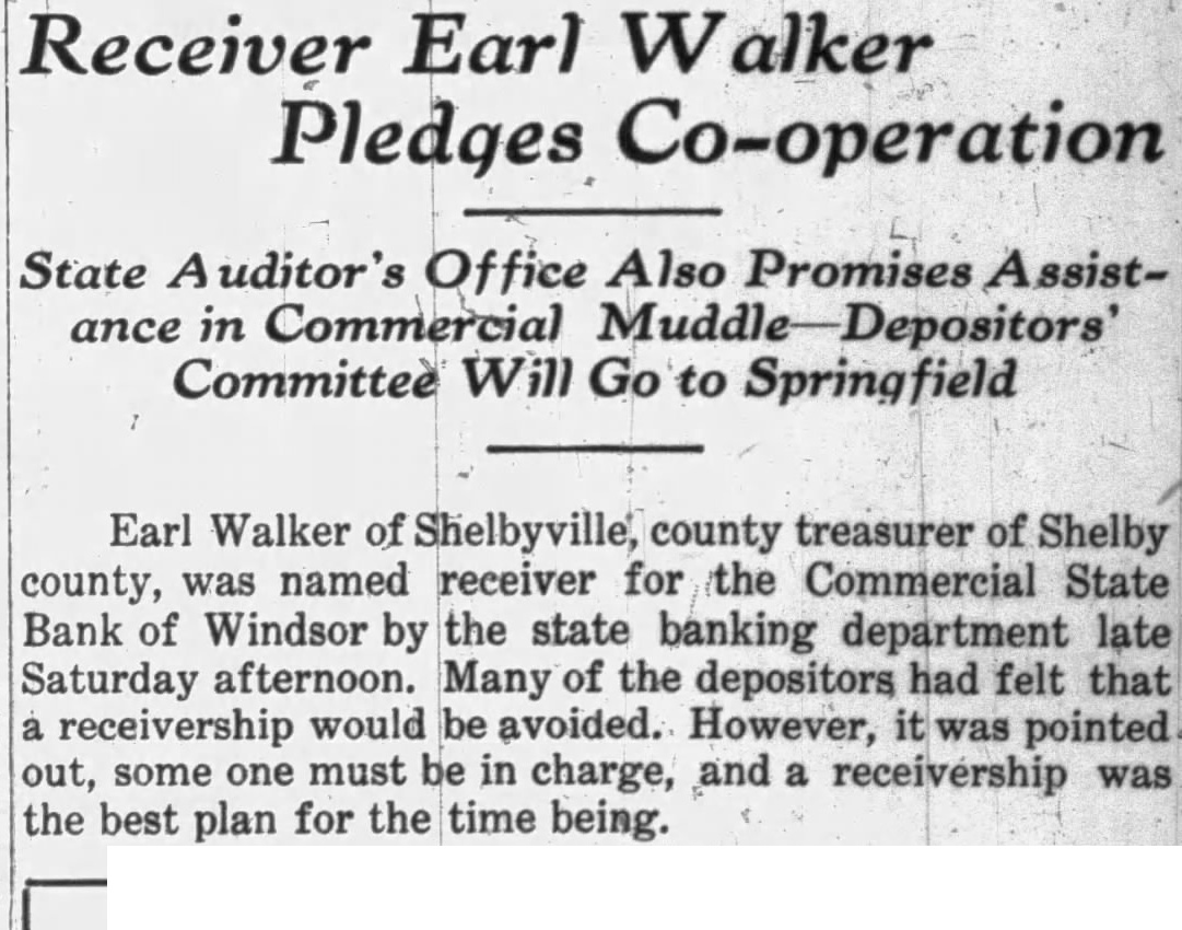 Receiver Earl Walker Pledges Co-operation State Auditor's Office Also Promises Assistance in Commercial Muddle-Depositors Committee Will Go to Springfield Earl Walker of Shelbyville, county treasurer of Shelby county, was named receiver for the Commercial State Bank of Windsor by the state banking department late Saturday afternoon. Many of the depositors had felt that a receivership would be avoided. However, it was pointed out, some one must be in charge, and a receivership was the best plan for the time being.