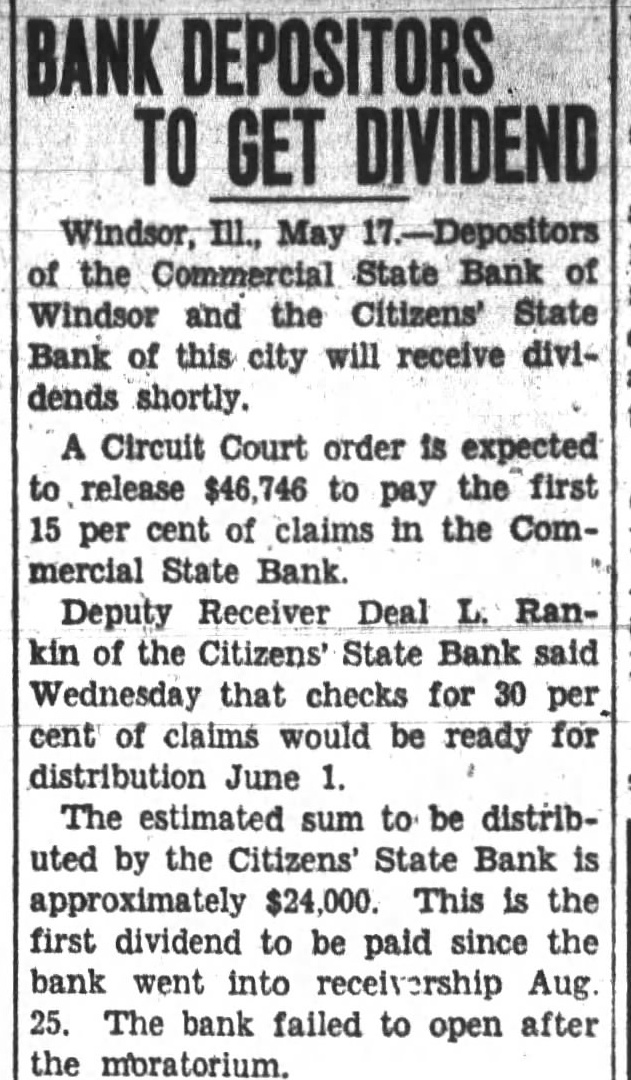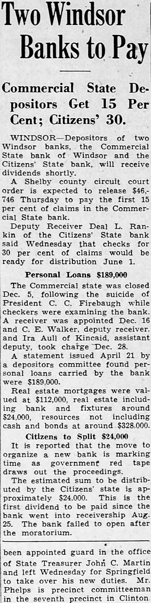Two Windsor Banks to Pay Commercial State Depositors Get 15 Per Cent; Citizens' 30. WINDSOR-Depositors of two Windsor banks, the Commercial State bank of Windsor and the Citizens' State bank, will receive dividends shortly. A Shelby county circuit court order is expected to release $46,746 Thursday to pay the first 15 per cent of claims in the Commercial State bank. Deputy Receiver Deal L. Rankin of the Citizens State bank said Wednesday that checks for 30 per cent of claims would be ready for distribution June 1. Personal Loans $189,000 The Commercial state was closed Dec. 5, following the suicide of President C. C. Firebaugh while checkers were examining the bank. A receiver was appointed Dec. 16 and C. E. Walker, deputy receiver. and Ira Aull of Kincaid, assistant deputy, took charge Dec. 28. A statement issued April 21 by a depositors committee found personal loans carried by the bank were $189,000. Real estate mortgages were valued at $112,000. real estate including bank and fixtures around $24,000, resources not including cash and bonds at around $328,000. Citizens to Split $24,000 It is reported that the move to organize a new bank is marking time as government red tape draws out the proceedings. The estimated sum to be distributed by the Citizens state is approximately $24,000. This is the first dividend to be paid since the bank went into receivership Aug. 25. The bank failed to open after the moratorium. been appointed guard in the office of State Treasurer John C. Martin and left Wednesday for Springfield to take over his new duties. Mr. Phelps is precinct committeeman in the seventh precinct in Clinton