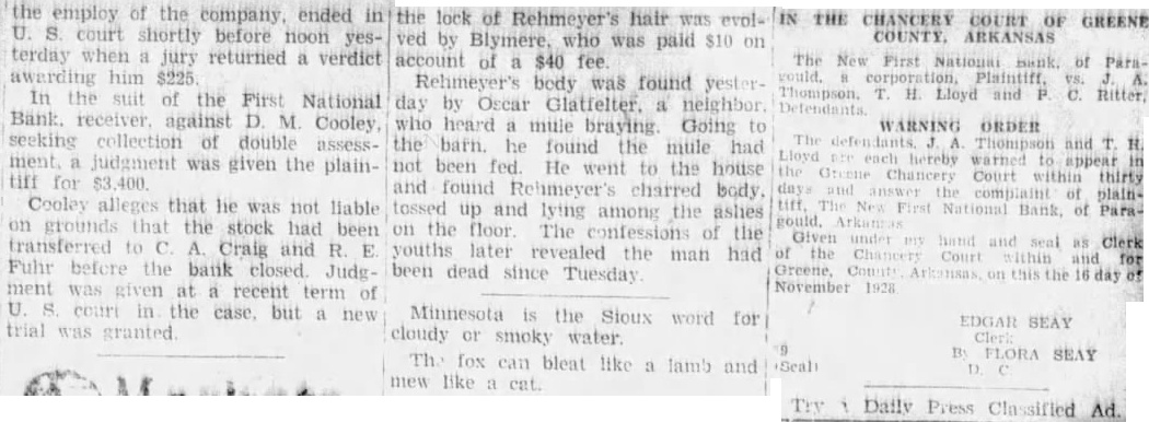 the employ of the company, ended U. S court shortly before noon yesterday when a jury returned a verdict awarding him $225 In the suit of the First National Bank receiver against D. M Cooley, seeking collection of double assessment judgment was given the plaintiff for Cooley alleges that he was not liable on grounds that the stock had been transferred to C. A. Craig and R. E Fuhr before the bank closed Judgment was given at a recent term of U. S. court in the case. but a new trial was granted the lock of Rehmeyer's hair was evolved by Blymere, who was paid $10 on account of a $40 fee Rehmeyer's body was found yesterday by Oscar Glatfelter. a neighbor who heard a mule braying Going to the barn. he found the mule had not been fed. He went to the house and found Rehmeyer's charred body tossed up and lying among the ashes on the floor The confessions of the youths later revealed the man had been dead since Tuesday Minnesota is the Sioux word for cloudy or smoky water Th fox can bleat like a lamb and mew like cat. IN THE CHANCERY COURT OF GREENE ARKANSAS The New First National Bank of Para- WARNING ORDER The Thompson and H. Lloyd hereby warned to appear the Chancery Court within thirty and the complaint plainGiven under hand and Clerk seal as of the Chancery Court within and for Greene, on day November 1928 EDGAR SEAY By FLORA SEAY Try Daily Press Classified Ad.