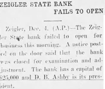 ZEIGLER STATE BANK FAILS TO OPEN Zeigler, Dec. 4. (A.P.)-The Zeigler State bank failed to open for business this morning. A notice posted on the door said that the bank was closed for examination and adjustment. The bank has a capital of $25,000 and B. Ashby is its president.
