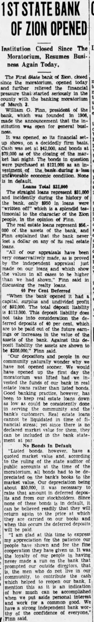 OPENED Institution Closed Since The Moratorium, Resumes Business Again Today. The First State bank of Zion, closed since moratorium opened today and further relieved the financial pressure started seriously in the county with the banking moratorium March William Finn, president of the bank, which 1906, made the that the stitution was open for general busiwas its financial setdecidedly Cash set bonds the closing of the market last The bonds in question were purchased an vestment the unfavorable economic condition. None in Loans Total $31,000 The straight loans represent and incidently during the history the $950 in loans "written which splendid timonial the character the Zion people, the opinion of Finn. The estate loans represent $56.000 the assets the and Finn explained that the bank never lost dollar on any of real estate of our appraisals have been very conservatively made, proved independent appraisal just on our loans which the cases be higher we had Finn said in discussing the realty loans. Cent Deferred "When the bank opened had capital, and undivided profit liability $113,000. This deposit liability does not take into dedeposits per cent. which are paid the future earnor the the assets the bank Against this liability are shown Finn said "Our and people in our wonder not opened We have opened the first day the moratorium lifted had vested the funds our loans rather listed bonds. Good banking practice, however, has been keep estate loans down consistently done serving the community and the bank's estate loans cannot liquidated time nancial stress: since there no declared market them, included in the bank statement Bonds In Default "Listed bonds market and. according the ruling the auditor public of the moratorium. had preciated the market value. Our being about was necessary that amount deferred deposand from stockholders Since none these bonds default can believed that they will return again the price which and they when this occurs the deferred deposits will paid glad this time to express the people have shown for the fine cooperation they have given the loyalty people having never made the bank that prompted outside that the who do not our contribute the which helped reopen bank an indication mention how much can accomplished aside personal interest put common good. We and independent bank thy the confidence of everyone," Finn