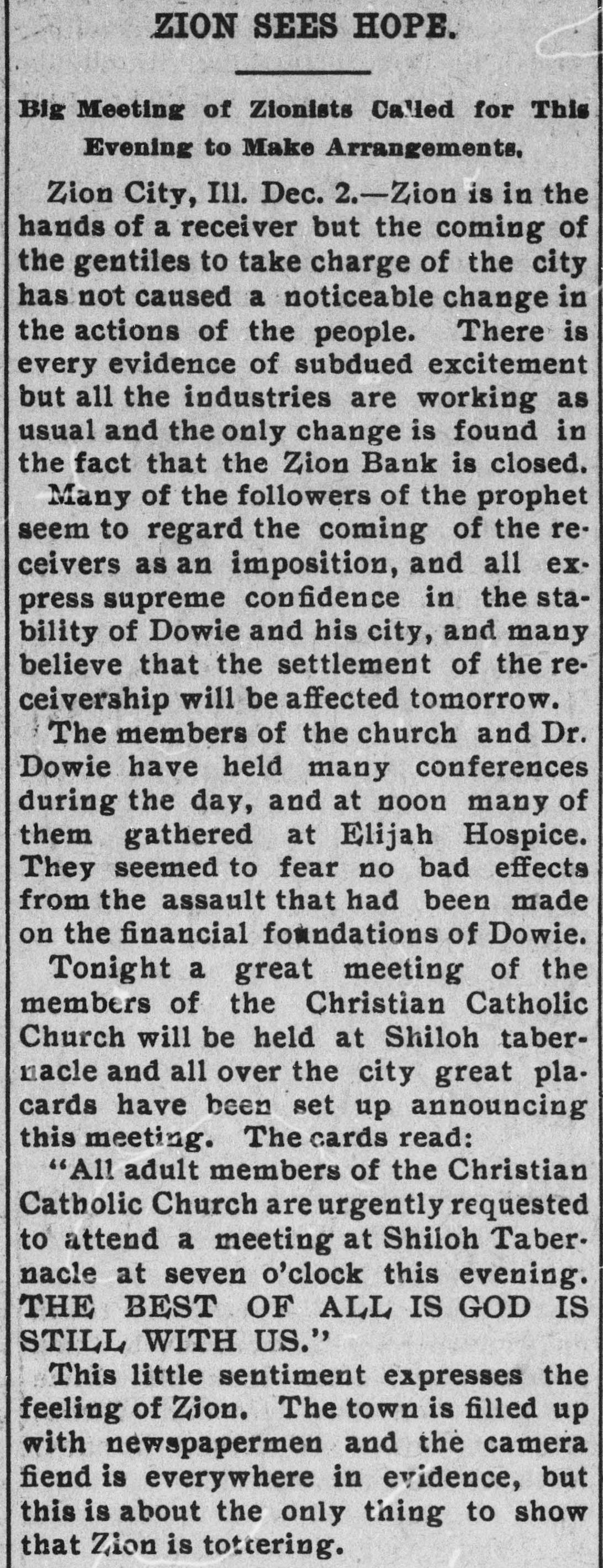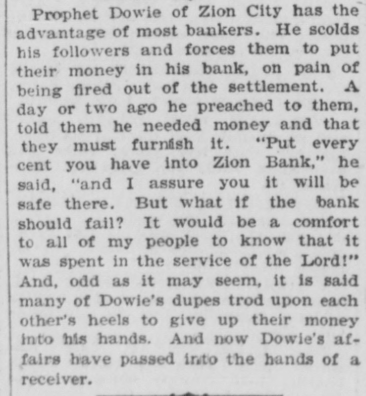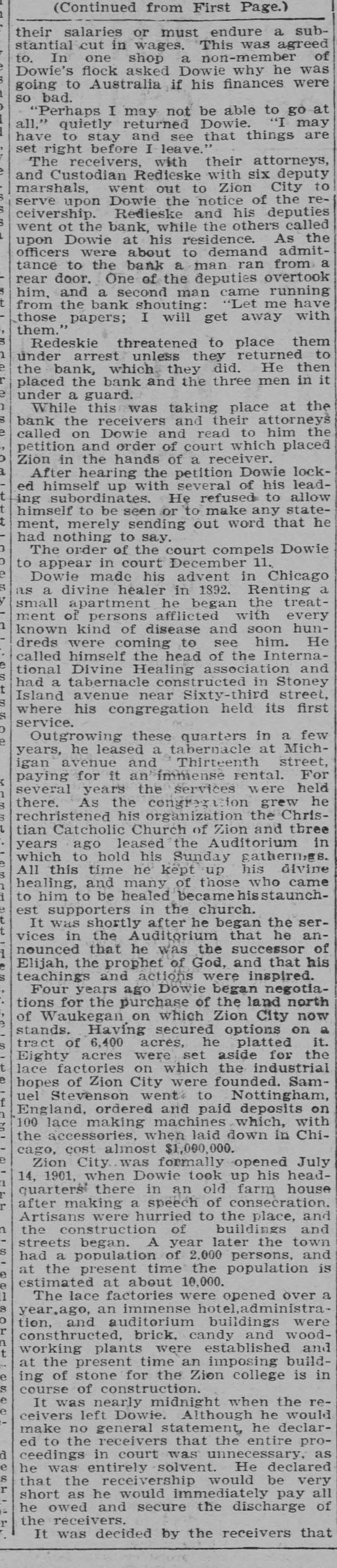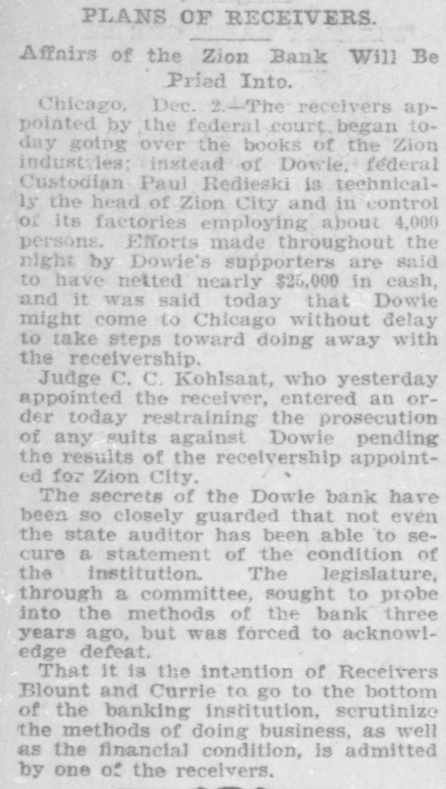It was nearly midnight when the receivers left Dowie. Although he would make no general statement, he declared to the receivers that the entire proceedings in court was unnecessary, as he was entirely solvent. He declared that the receivership would be very short as he would immediately pay all he owed and secure the discharge of the receivers.