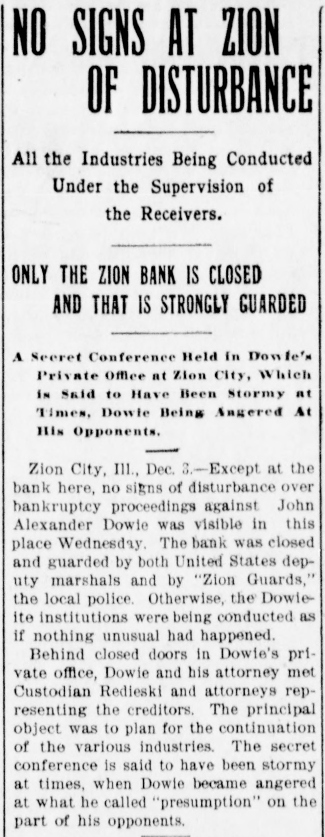 After hearing the petition Dowie locked himself up with several of his leading subordinates. He refused to allow himself to be seen or to make any statement, merely sending out word that he had nothing to say.