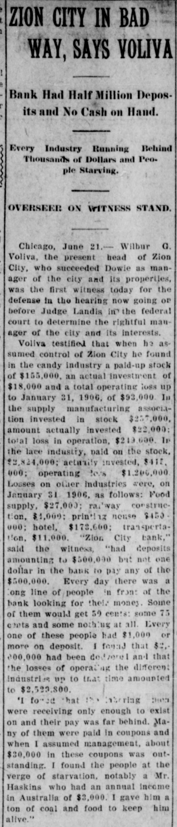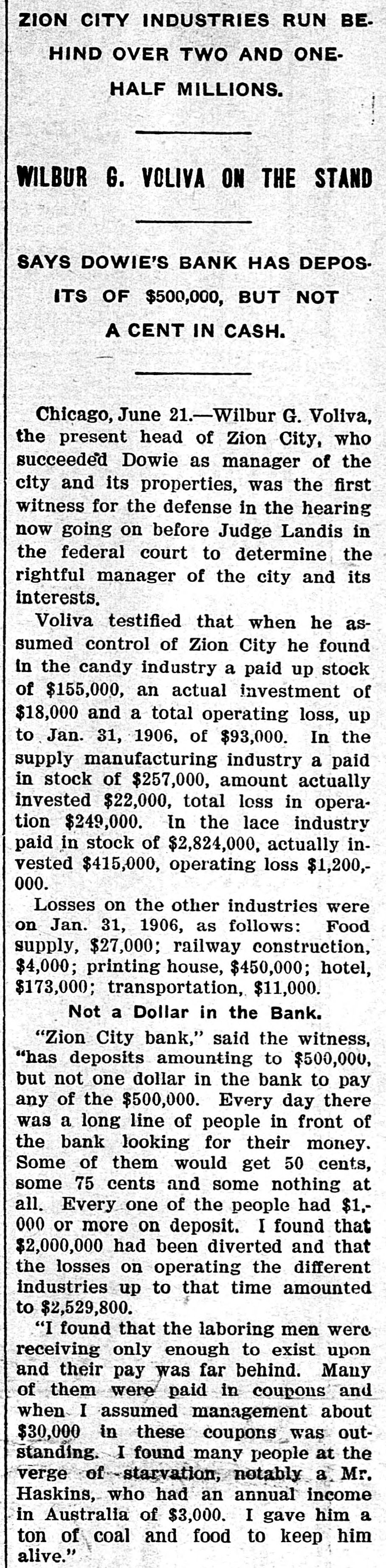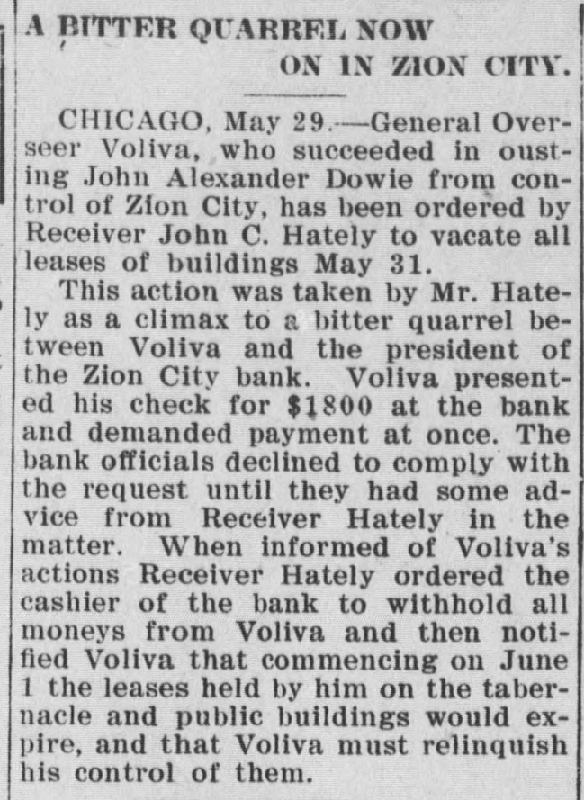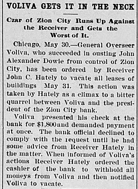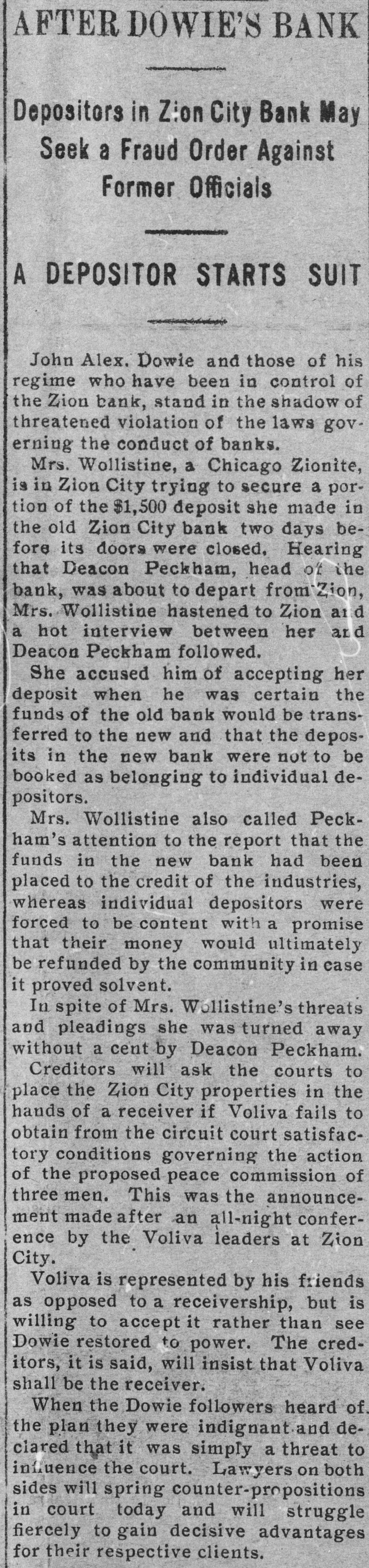 AFTER DOWIE'S BANK / Depositors in Zion City Bank May Seek a Fraud Order Against Former Officials / A DEPOSITOR STARTS SUIT John Alex. Dowie and those of his regime who have been in control of the Zion bank, stand in the shadow of threatened violation of the laws governing the conduct of banks. Mrs. Wollistine, a Chicago Zionite, is in Zion City trying to secure a portion of the $1,500 deposit she made in the old Zion City bank two days before its doors were closed. Hearing that Deacon Peckham, head o't the bank, was about to depart from Zion, Mrs. Wollistine hastened to Zion at d a hot interview between her an d Deacon Peckham followed. She accused him of accepting her deposit when he was certain the funds of the old bank would be transferred to the new and that the deposits in the new bank were not to be booked as belonging to individual depositors. Mrs. Wollistine also called Peckham's attention to the report that the funds in the new bank had been placed to the credit of the industries, whereas individual depositors were forced to be content with a promise that their money would ultimately be refunded by the community in case it proved solvent. In spite of Mrs. Wollistine's threats and pleadings she was turned away without a cent by Deacon Peckham. Creditors will ask the courts to place the Zion City properties in the hands of a receiver if Voliva fails to obtain from the circuit court satisfactory conditions governing the action of the proposed peace commission of three men. This was the announcement made after an all-night conference by the Voliva leaders at Zion City. Voliva is represented by his friends as opposed to a receivership, but is willing to accept it rather than see Dowie restored to power. The creditors, it is said, will insist that Voliva shall be the receiver. When the Dowie followers heard of the plan they were indignant and declared that it was simply a threat to infuence the court. Lawyers on both sides will spring counter-propositions in court today and will struggle fiercely to gain decisive advantages for their respective clients.