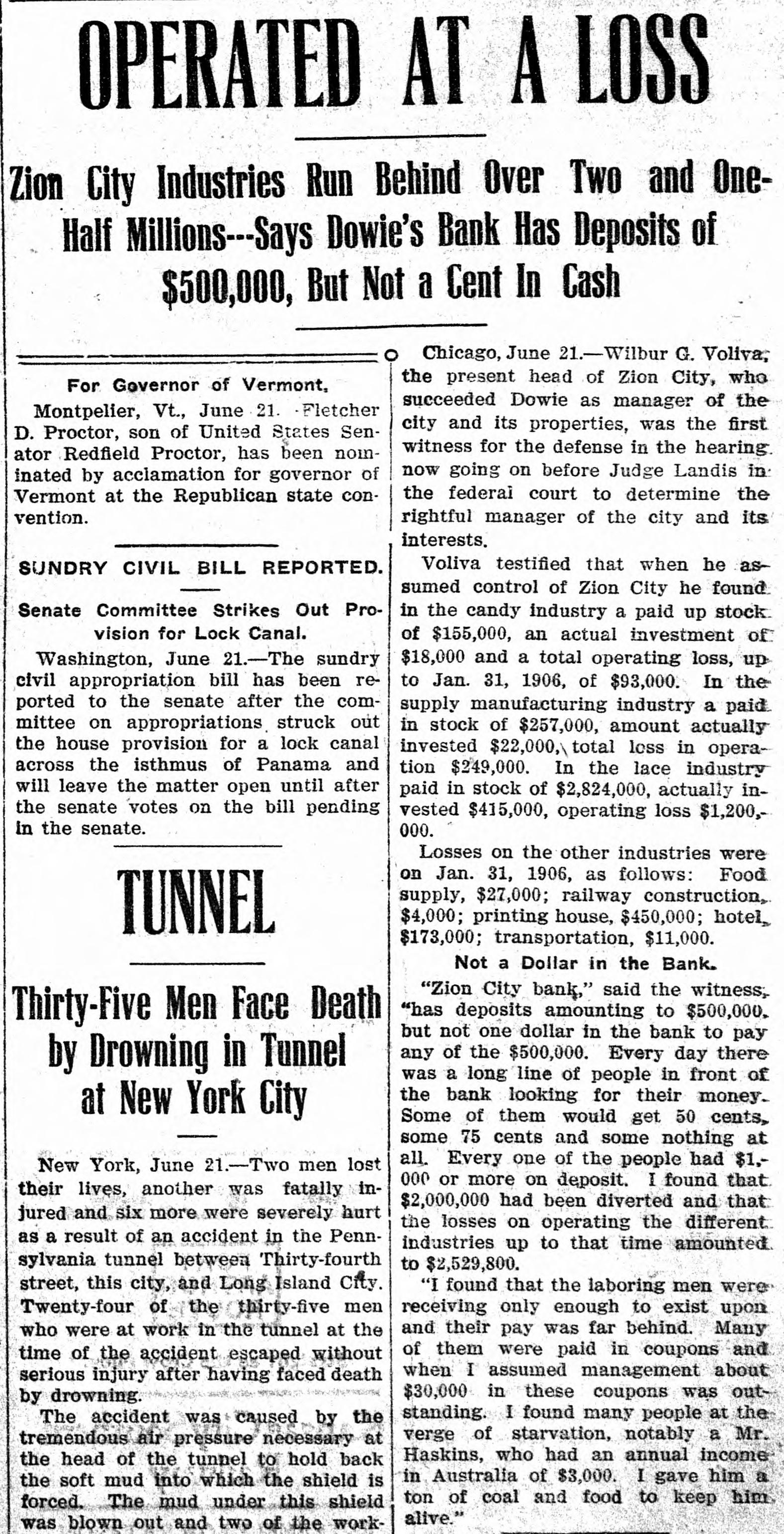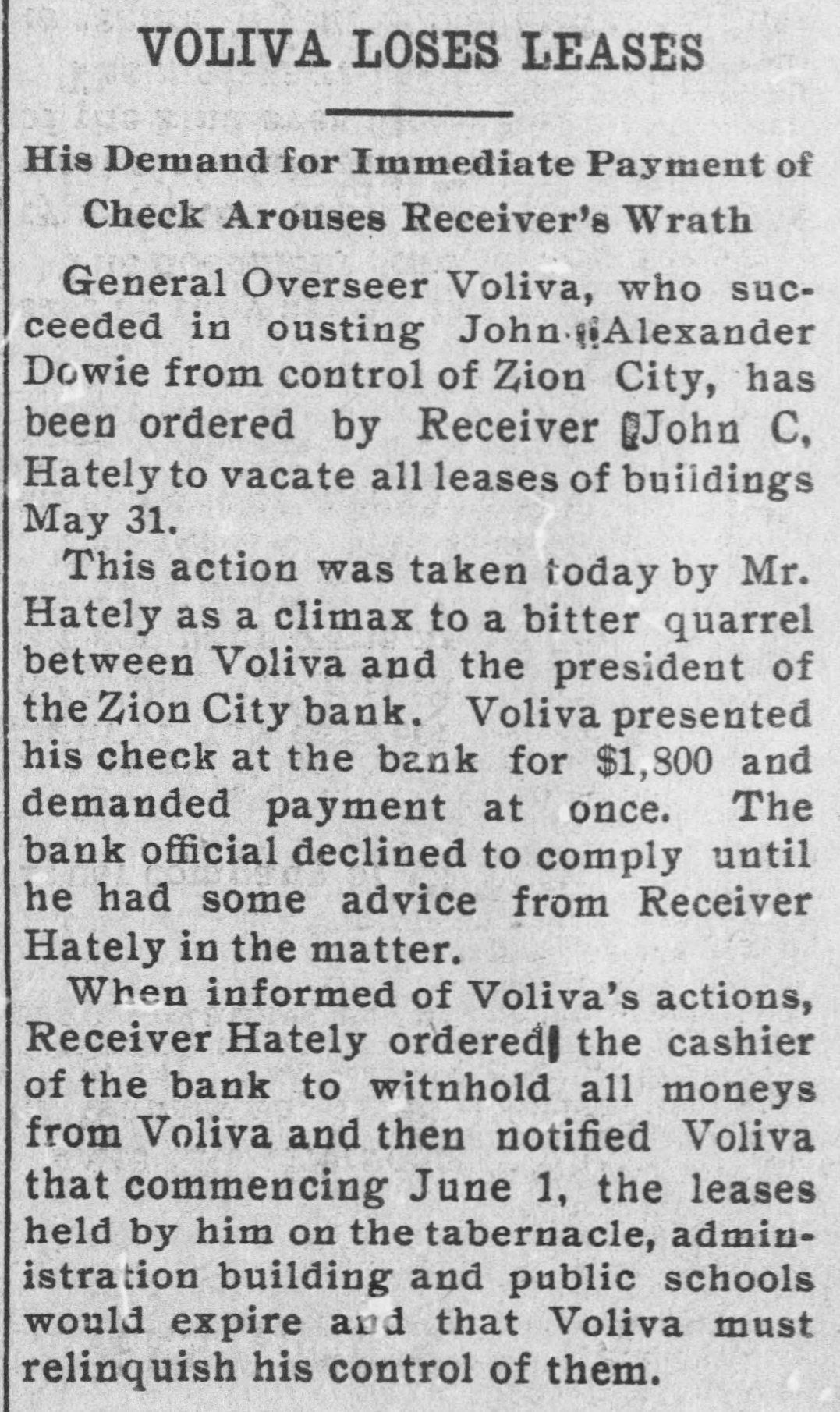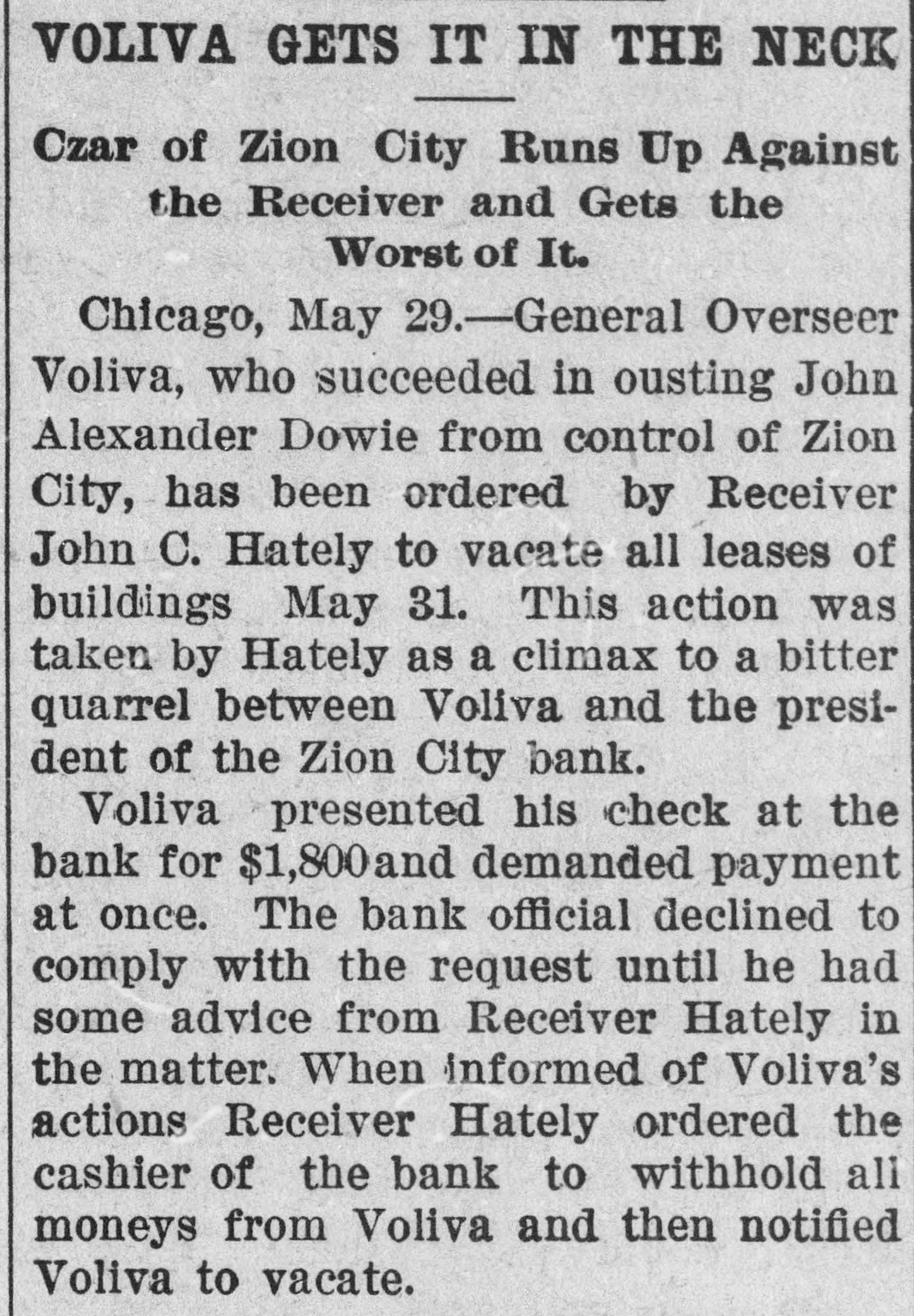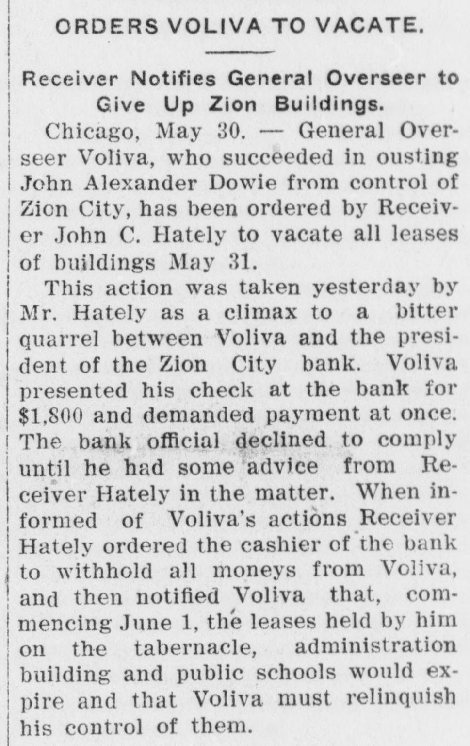 AFTER DOWIE'S BANK / Depositors in Zion City Bank May Seek a Fraud Order Against Former Officials / A DEPOSITOR STARTS SUIT John Alex. Dowie and those of his regime who have been in control of the Zion bank, stand in the shadow of threatened violation of the laws governing the conduct of banks. Mrs. Wollistine, a Chicago Zionite, is in Zion City trying to secure a portion of the $1,500 deposit she made in the old Zion City bank two days before its doors were closed. Hearing that Deacon Peckham, head o't the bank, was about to depart from Zion, Mrs. Wollistine hastened to Zion at d a hot interview between her an d Deacon Peckham followed. She accused him of accepting her deposit when he was certain the funds of the old bank would be transferred to the new and that the deposits in the new bank were not to be booked as belonging to individual depositors. Mrs. Wollistine also called Peckham's attention to the report that the funds in the new bank had been placed to the credit of the industries, whereas individual depositors were forced to be content with a promise that their money would ultimately be refunded by the community in case it proved solvent. In spite of Mrs. Wollistine's threats and pleadings she was turned away without a cent by Deacon Peckham. Creditors will ask the courts to place the Zion City properties in the hands of a receiver if Voliva fails to obtain from the circuit court satisfactory conditions governing the action of the proposed peace commission of three men. This was the announcement made after an all-night conference by the Voliva leaders at Zion City. Voliva is represented by his friends as opposed to a receivership, but is willing to accept it rather than see Dowie restored to power. The creditors, it is said, will insist that Voliva shall be the receiver. When the Dowie followers heard of the plan they were indignant and declared that it was simply a threat to infuence the court. Lawyers on both sides will spring counter-propositions in court today and will struggle fiercely to gain decisive advantages for their respective clients.