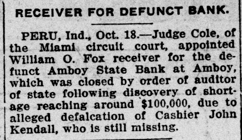 BANK CLOSED; $80,000 GONE Cashier of the Amboy (Ind.) State Institution Disappeared a Week Ago. I Amboy, Ind., Oct. 12.-Following an examination of the books of the Amboy State bank here and after it had been ascertained that John W. Kendall, former cashier of the bank, had disappeared about a week ago, the bank was closed by Robert Trass, a field examiner from the state banking department. Mr. Trass stated that the shortage of the bank was between $80,000 and $90,000. Kendall had been cashier of the bank for about four years. but was removed last week. It is expected a receiver will be appointed for the bank.
