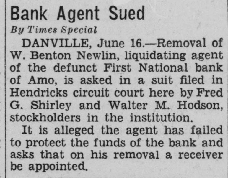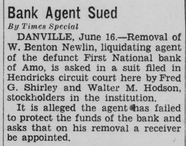 Bank Agent Sued By Times Special DANVILLE, June 16.-Removal of W. Benton Newlin, liquidating agent of the defunct First National bank of Amo, is asked in a suit filed in Hendricks circuit court here by Fred G. Shirley and Walter M. Hodson, stockholders in the institution. It is alleged the agent has failed to protect the funds of the bank and asks that on his removal a receiver be appointed.
