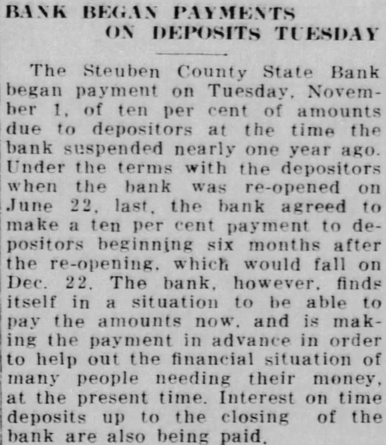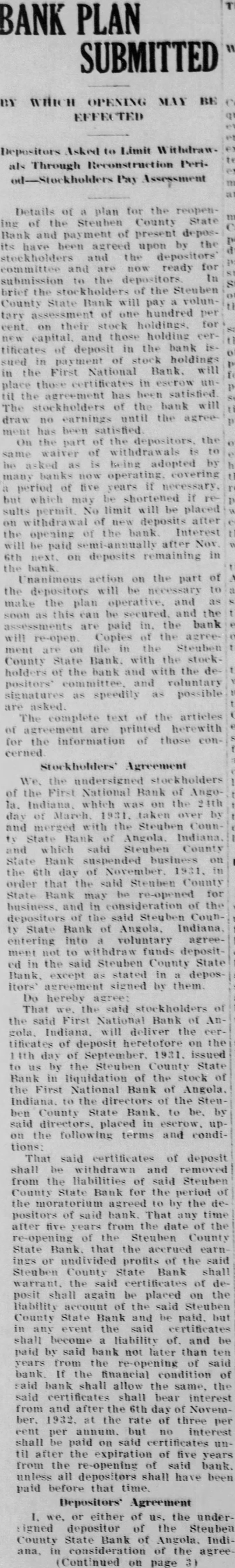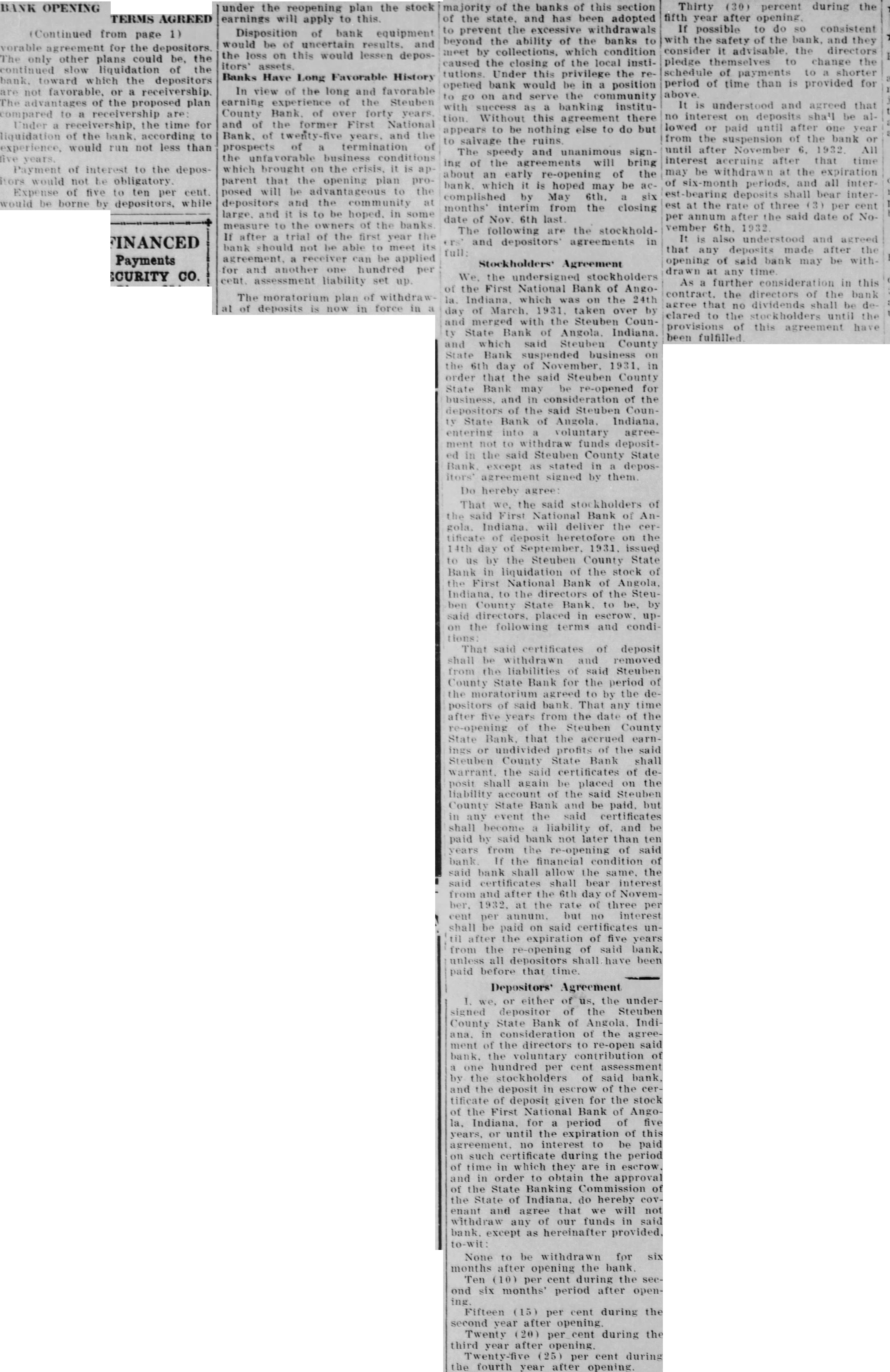 (Continued from page 1) vorable agreement for the depositors The only other plans could be, the continued slow liquidation of the bank. toward which the depositors are not favorable. or a receivership. The advantages of the proposed plan compared to a receivership are: Under a receivership, the time for liquidation of the bank. according to experience, would run not less than five years Payment of interest to the deposhors would not be obligatory Expense of five to ten per cent. would be borne by depositors, while under the reopening plan the stock earnings will apply to this Disposition of bank equipment would be of uncertain results. and the loss on this would lessen deposassets. Banks Have Long Favorable History In view of the long and favorable earning experience of the Steuben County Bank of over forty years and of the former First National Bank. of twenty-five years. and the prospects of a termination of the unfavorable business conditions which brought on the crisis, it is apparent that the opening plan proposed will be advantageous to the depositors and the community at large. and it is to be hoped. in some measure to the owners of the banks If after a trial of the first year the bank should not be able to meet its agreement. a receiver can be applied for and another one hundred per cent. assessment liability set up.