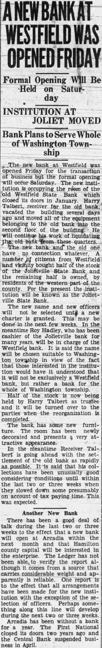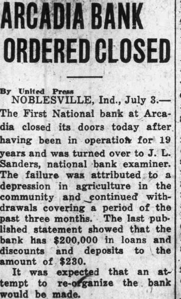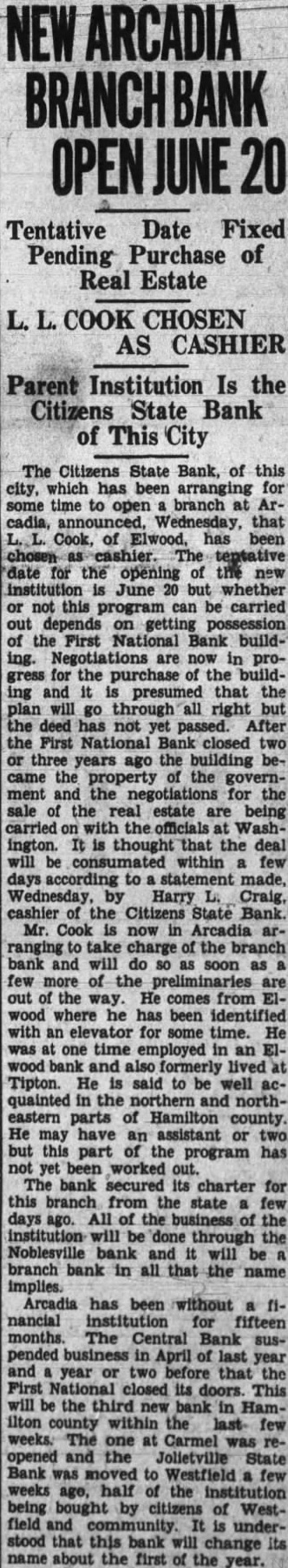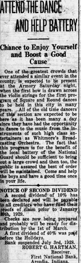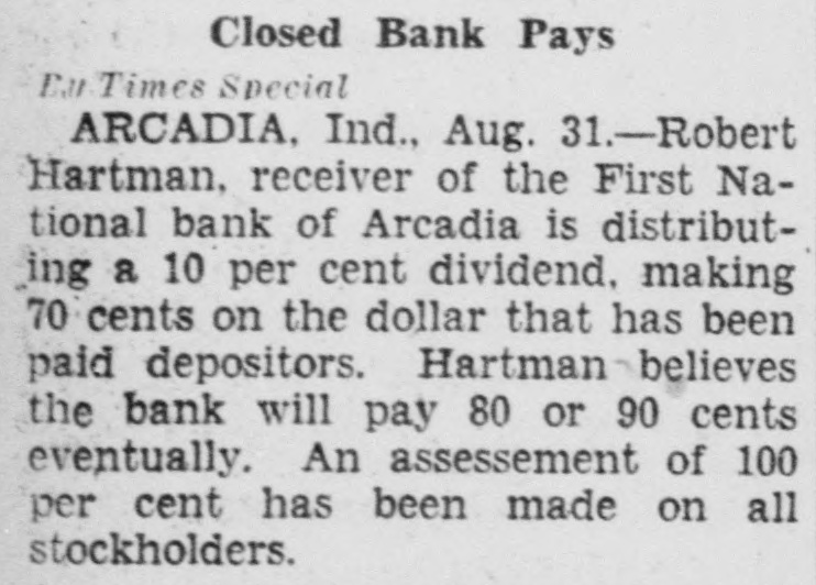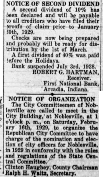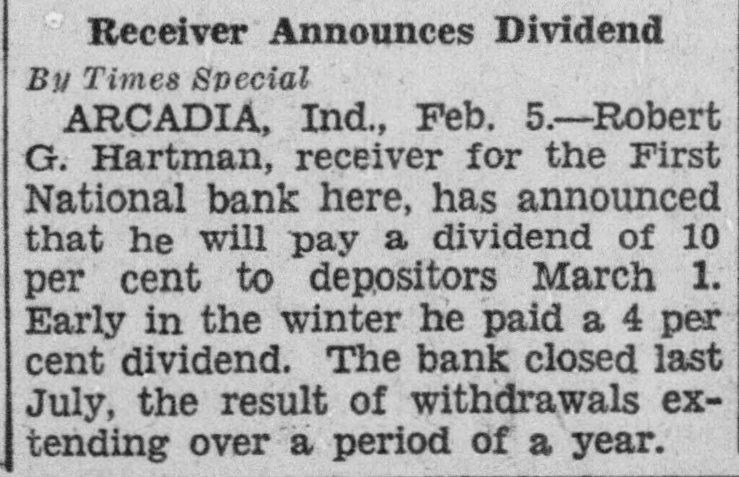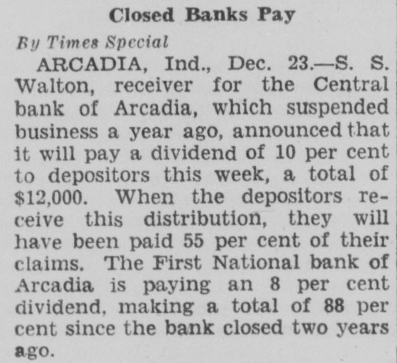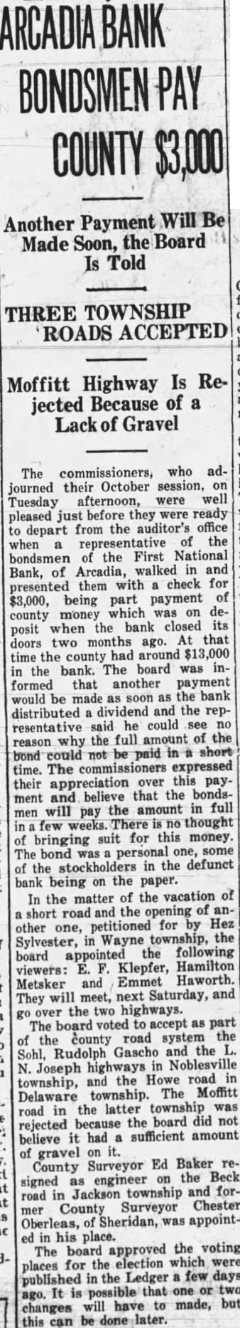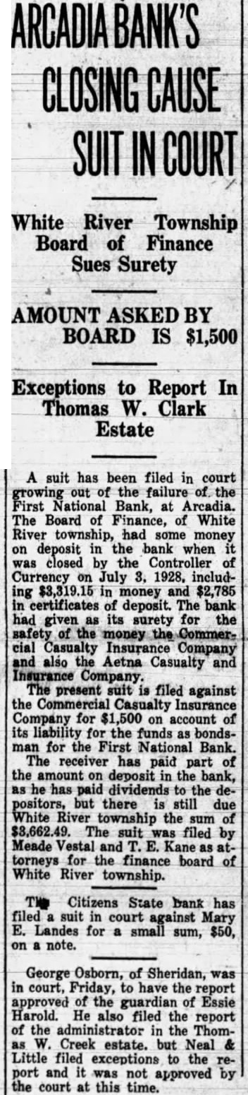 A suit has been filed in court growing out of the failure of the First National Bank, at Arcadia. The Board of Finance, of White River township, had some money on deposit in the bank when it was closed by the Controller of Currency on July 3, 1928, including $3,319.15 in money and $2,785 in certificates of deposit. The bank had given as its surety for the safety of the money the Commercial Casualty Insurance Company and also the Aetna Casualty and Insurance Company. The present suit is filed against the Commercial Casualty Insurance Company for $1,500 on account of its liability for the funds as bondsman for the First National Bank. The receiver has paid part of the amount on deposit in the bank, as he has paid dividends to the depositors, but there is still due White River township the sum of $3,662.49. The suit was filed by Meade Vestal and T. E. Kane as attorneys for the finance board of White River township.