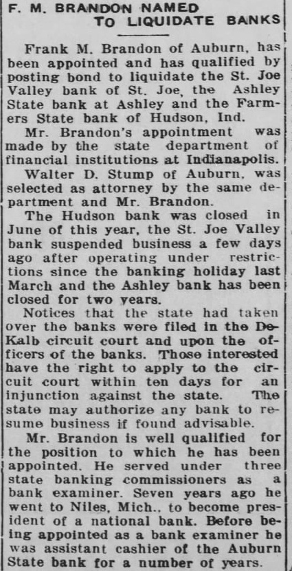 F. M. BRANDON NAMED LIQUIDATE BANKS Frank M. Brandon of Auburn, has been appointed and has qualified by posting bond to liquidate the St. Valley bank of St. Joe, Ashley State bank at Ashley and the FarmState bank of Hudson, Ind. Mr. Brandon's appointment was made by state department financial institutions at Indianapolis. Walter D. Stump of Auburn, selected attorney by the same deand Mr. Brandon. The Hudson bank was closed in June this year, the St. Joe Valley bank suspended few days ago after operating under tions since the banking holiday last March and the Ashley bank has been closed for two years. Notices that the state had taken the banks were filed in the DoKalb circuit court and upon the officers of the banks. Those have the right to apply to the circourt within days for injunction against the state. The state may any bank to business if found Mr. Brandon is well qualified for the position which he has been appointed. He served under three state banking commissioners as bank examiner. Seven years ago went to Niles, to become president of national bank. Before ing appointed bank examiner assistant cashier of the Auburn State bank for number of