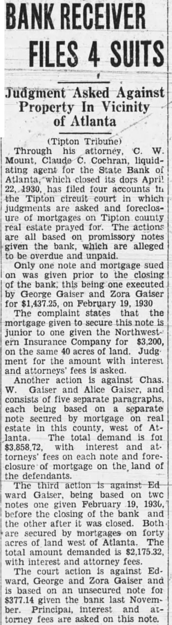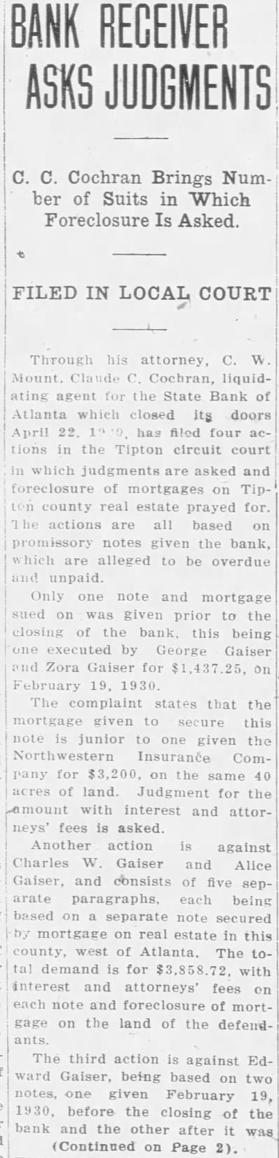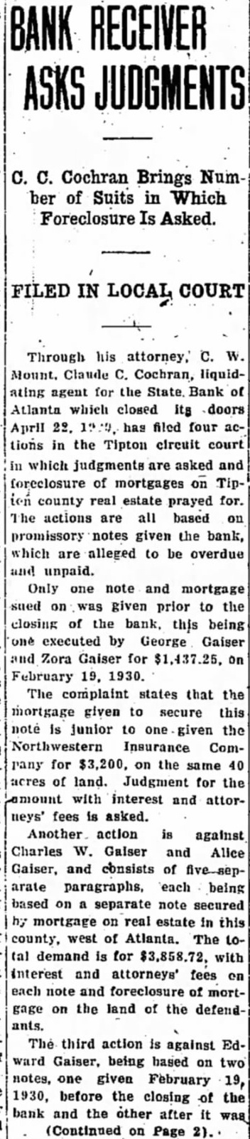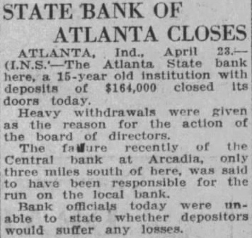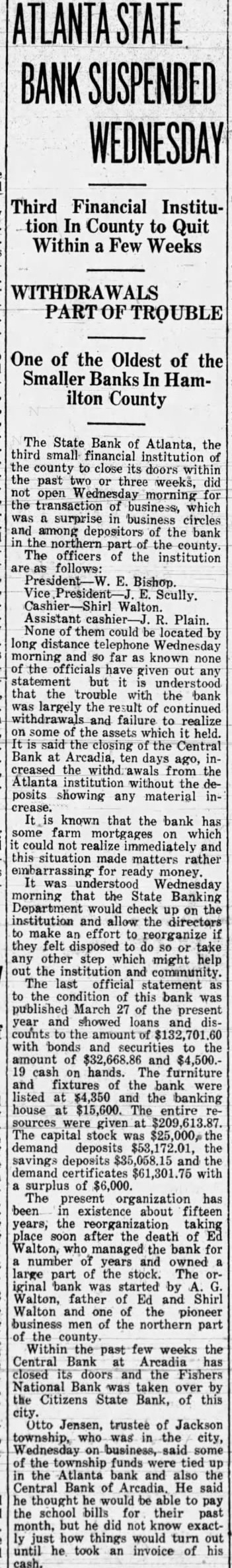 The State Bank of Atlanta, the third small financial the county to close its doors the past three weeks, not open morning for the transaction of which business, surprise business circles and among depositors of the bank the county. The officers of the institution follows: Bishop. Scully. Walton. Assistant Plain. None them could located long distance telephone Wednesday morning far known none the officials have given out any statement but that the trouble with the bank largely the result of continued withdrawals and failure realize some of the assets which held. said the closing of the Central Bank Arcadia, ten days ago, creased the from the Atlanta institution without the posits showing any material crease. known that the bank has farm on which could not and this situation made matters rather for ready money. was Wednesday morning that the State Banking Department would check up on the institution and allow the directors to make effort reorganize they felt disposed so take any other step which might help the institution community. The last official statement to the condition of this bank was published March of the present year and showed loans and discounts to the amount with bonds and the amount of and on hands. The furniture and fixtures the bank were listed at $4,350 and the banking house $15,600. The entire given The capital stock demand deposits the savings deposits and demand with surplus of $6,000. The present organization has been existence about fifteen years, the reorganization taking place soon after the death Walton, who the bank number of years owned large part of stock. The iginal bank was started by Walton, father of Ed and Shirl Walton and one of the pioneer business men of the northern part of the county Within the past few weeks the Central Bank Arcadia has closed doors the Fishers Bank was taken over the Citizens State Bank, of this city. Otto Jensen, trustee of Jackson township, who the city, said the township funds were tied the Atlanta bank and also the Central Bank Arcadia. He said he thought would be able to pay the school bills for their past month, but he did not know exacthow things would out until he took an invoice cash.