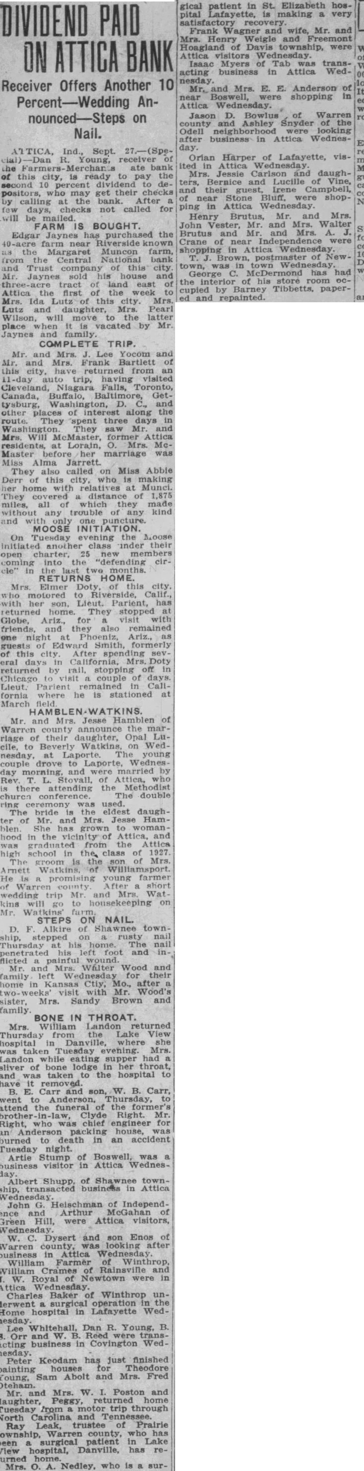 DIVIDEND PAID ON ATTICA BANK Receiver Offers Another 10 Percent-Wedding Announced-Steps on Nail. ATTICA, Ind., Sept. 27.-(SpeR. Young, receiver of the Farmers. Merchants ate bank of this city, is ready to pay the second 10 dividend to depositors, who may get their checks by calling at the bank. After few days, checks not called for will be mailed. FARM IS BOUGHT. Edgar Jaynes has purchased the 40-acre farm near Riverside known us the Margaret Muncon farm, the Central National bank and Trust company of this city Mr. Jaynes sold his house and three-acre tract of land east of Attica the first of the week to Mrs. Ida Lutz this city. Mrs. Lutz and daughter, Mrs. Pearl Wilson, will move to the latter place when is vacated by Mr. Jaynes and family. COMPLETE TRIP. Mr. and Mrs. Lee Yocom and Mr. and Mrs. Frank Bartlett of this city, have returned from an 11-day auto trip, having visited Cleveland, Niagara Falls, Toronto, Canada, Buffalo, Baltimore, Gettysburg, Washington, D. and other places of interest along the route. They spent three days in Washington They saw Mr. and Mrs. Will McMaster, former Attica residents, at Lorain, O. Mrs. McMaster before her marriage was Miss Alma Jarrett. They also called on Miss Abble Derr of this city, who is making her home with relatives at Munci. They covered a distance of 1,875 miles, all of which they made without any trouble of any kind and with puncture. MOOSE INITIATION. On Tuesday evening the Moose initiated another class inder their open charter, 25 new members coming into the "defending circle" in two months. RETURNS HOME. Mrs. Elmer Doty of this city who motored to Riverside, Calif., with her son. Lieut. Parient, has returned home. They stopped at Globe, Ariz., for visit with one night at Phoeniz, Ariz., as guests of Edward Smith, formerly of this city. After spending several days in California, Mrs. Doty returned by rail, stopping off in Chicago visit couple of days. Lieut. Parient remained in Callfornia where he is stationed at March field HAMBLEN-WATKINS. Mr. and Mrs. Jesse Hamblen of Warren county announce the marriage of their daughter, Opal Lucile, to Beverly Watkins, on Wednesday, at Laporte. young couple drove to Laporte, Wednesday morning, and were married by Rev. Stovall, of Attica, who is there attending the Methodist church conference. The double ring ceremony was used. The bride is the eldest daughter of Mr. and Mrs. Jesse Hamblen. She has grown to womanhood in the vicinity of Attica, and was graduated from the Attics high school in the class of 1927 The groom is the of Mrs. Arnett Watkins, Williamsport. He is promising young farmer of Warren county After short wedding trip Mr and Mrs. Wat kins will go to housekeeping on Mr. Watkins' STEPS ON NAIL. D. F. Alkire of Shawnee township, stepped on rusty nail Thursday at his home. The nail penetrated his foot and inflicted painful wound. Mr. and Mrs. Whlter Wood and family left Wednesday for their home in Kansas Ctiy, Mo., after a two-weeks' visit with Mr. Wood's sister, Mrs. Sandy Brown and family BONE IN THROAT Mrs. William Landon returned Thursday from the Lake View hospital in Danville, where she was taken Tuesday evening. Mrs. Landon while eating supper had a sliver of bone lodge in her throat, and was taken to the hospital to have it B. E. Carr and son, W. B. Carr, went to Anderson, Thursday, to attend the funeral of the former's brother Clyde Right. Mr. Right, who chief engineer for an packing house, was burned to death in an accident Tuesday night. Artie Stump of Boswell, was a business visitor in Attica Wednesday Albert Shupp, of Shawnee township, transacted business in Attica Wednesday John G. Heischman of Independence and Arthur McGahan of Green Hill, were Attica visitors, Wednesday W. C. Dysert and son Enos of Warren county, was looking after business in Attica Wednesday William Farmer of Winthrop, William Crames of Rainsville and J. W. Royal of Newtown were in Attica Wednesday. Charles Baker of Winthrop underwent surgical operation in the Home hospital in Lafayette Wednesday Lee Whitehall, Dan R. Young, B. S. Orr and W. B. Reed were transacting business in Covington Wednesday. Peter Keodam has just finished painting houses for Theodore Young, Sam Abolt and Mrs. Fred Oteham. Mr. and Mrs. W. Poston and daughter, Peggy, returned home Tuesday from motor trip through North Carolina and Ray Leak, trustee of Prairie township, Warren county, who has been surgical patient in Lake View hospital, Danville, has returned home. Mrs. O. A. Nedley, who is a sur- gical patient in St. Elizabeth hospital Lafayette, is making a very satisfactory recovery. Frank Wagner and wife, Mr. and Mrs. Henry Weigle and Freemont Hoagland of Davis township, were Attica visitors Wednesday Isaac Myers of Tab was transacting business in Attica WedMr. and Mrs. E. E. Anderson of near Boswell, were shopping in Attica Wednesday. Jason D. Bowlus of Warren county and Ashley Snyder of the Odell neighborhood were looking after business in Attica Wednesday. Orian Harper of Lafayette, visited in Attica Wednesday. Mrs. Jessie Carlson and daughters, Bernice and Lucille of Vine, and their guest, Irene Campbell, of near Stone Bluff, were shopping in Attica Wednesday Henry Brutus, Mr. and Mrs. John Vester, Mr. and Mrs. Walter Brutus and Mr. and Mrs. Crane of near Independence were shopping in Attica Wednesday T.J. Brown, postmaster of New. town, was in town Wednesday. George McDermond has had the interior of his store room OCcupied by Barney Tibbetts, papered and repainted.