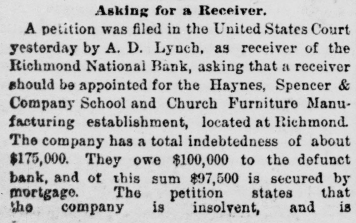ANOTHER BANK SUSPENDS. The Richmond National Has Abundance of Good Assets, but Needs Current Funds. Special to the Indianapolis Journal. RICHMOND, Ind., July 21.-The - Richmond National Bank, of which Charles F. Coffin is president, and his son, Charles H. Coffin, cashier, was unable to pay its balances when the banks made their settlements this afternoon, and its doors will to-morrow stand closed. The officers claim that the assets certainly exceed the liabilities by upwards of $200,000, and that in the end even the stockholders will lose nothing, but that they must suspend for the want of funds to meet current demands. The accounts of a few of the largest depositors were settled to-day by transferring notes to them, and there will be an effort made to settle other accounts in the same way. Before any settlements were made, the deposit accounts amounted to $349,000. In this is included school funds, perhaps $20,000; county funds, said to be over $100,000, and Wayne township funds to an amount not stated. The settlements made to-day reduced the deposit accounts to $188,000. The bills payable amount to $20,000 more, making total lia bilities of $208,000. The officers claim to have good assets, including the notes used in settlement with depositors to-day, as follows: Loans and discounts, $580,000; cash items. $22,500; total, $602,500. There has been no run unon the bank. It had the complete confidence of its patrons, and a premium has been offered for its stock within a few days; yet there are those who have doubted its soundness for months back. Bank Examiner A. J. Hay has been telegraphed, and is expected to-night.