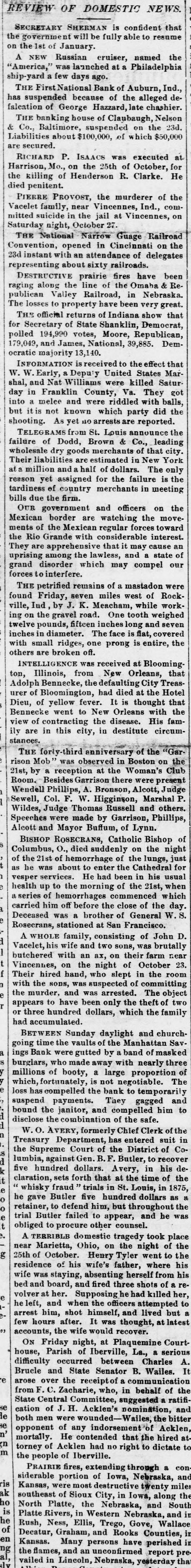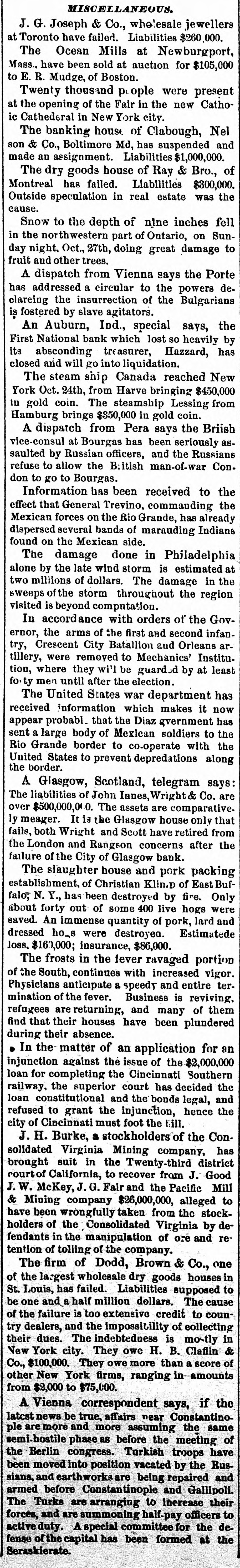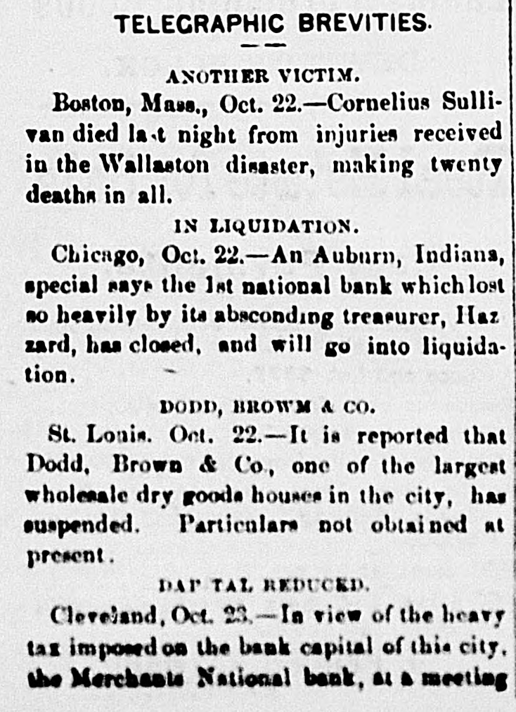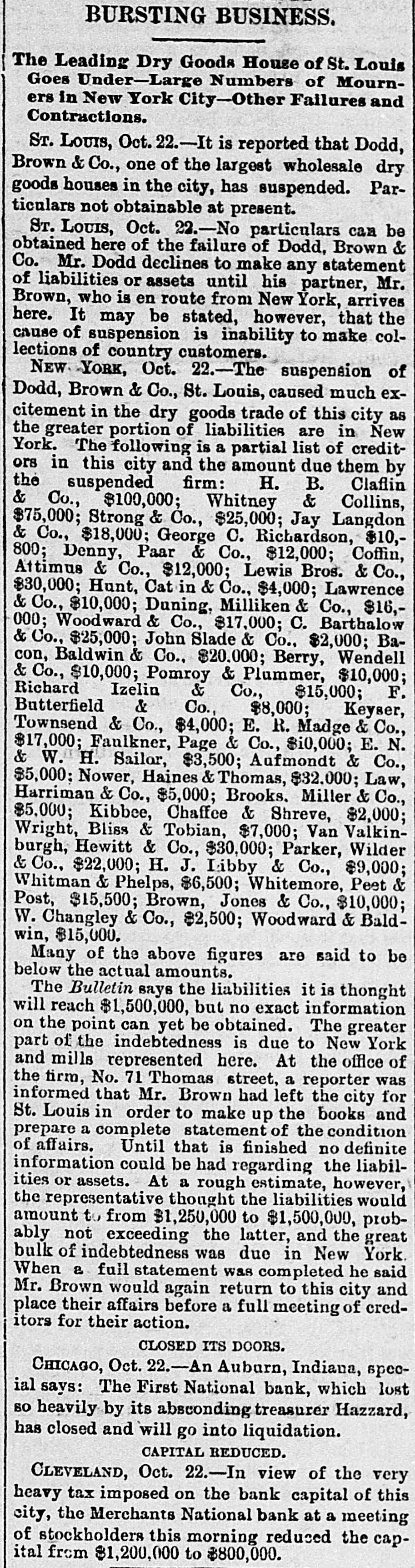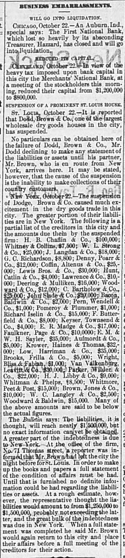 BUSINESS EMBARRASSMENTS. WILL GO INTO LIQUIDATION. CHICAGO, October 22.-An Auburn,Ind., special says: The First National Bank, which lost so heavily by its absconding Treasurer, Hazzard, has closed and will go liquidation, REDUCED ITS CAPITAL CLEVELAND, October In view of the heavy tax imposed upon bank capital in this city the Merchants' National Bank, at a meeting of the stockholders this morning, reduced their capital from $1,200,000 to $800,000. SUSPENSION OF A PROMINENT ST. LOUIS HOUSE. Sr. Louis, October 22.-It is reported that Dodd, Brown & Co., one of the largest wholesale dry goods houses in the city, has suspended. No particulars can be obtained here of the failure of Dodd, Brown & Co., Mr. Dodd declining to make any statement of the liabilities or assets until his partner, Mr. Brown, who is en route from New York, arrives here. It may be stated, however, that the cause of the suspension is the inability to make collections of their country customers. New YORK, October 22 The suspension of Dodge, Brown & Co. caused much excitement in the dry goods trade in this city. The greater portion of their liabilities are in New York. The following is a partial list of the creditors in this city and the amounts due them by the suspended firm: H. B. Chaflin & Co., $100,000; Whitney & Collins, $7,500; W. L. Strong & Co., $25,000; J. Langdan & Co., $18,000; G.C. Richardson, $8,800; Denny, Poarr & Co., $12,000; Coffin, Altenus & Co., $25,000: Lewis Bros. & Co., $30,000; Hunt, Catlin & Co., $4,000; Lawrence & Co., $10,000; Deering & Mulliken, $16,000; Woodward & Co., $12,000; C. Bartholow & Co., $25,000; John Slade & Co., $20,000; Bacon, Baldwin & Co., $2,000; Pern, Wendell & Co., $1,000; Pomeroy & Plummer, $1,000; Richard Iselin & Co., $15,000; F. Butterfield & Co., $8,000; Keyser, Townsend & Co., $4,000; E. R. Madge & Co., $17,000; Faulkner, Page & Co., $10,0000; E.M. & W. H. Sayler, $35,000; Aufmordt & Co., $5,000; Krower, Haines & Thomas, $32,000; Low, Harriman & Co., $35,000; Brooks, Frilla & Co., $5,000; Wright, Bliss & Fabian, $1,000; Van Valkenburg, Leavitt& Co., $30,000; Parker, Wilder & Co., $22,000; H. . J. Libby & Co.,$9,000; Whitman & Phelps, $8,500; Whitmore, Peet Post, $15,000; Brown, Jones & Co., $10,000; W. C. Langley & Co., $2,500; Woodward & Baldwin, $15,000. Many of the above amounts are said to be below the actual figures. The Bulletin says: The liabilities, it is thought, will reach nearly $1,500,000, but no exact information caniyet be obtained. A greater part of the indebtedness is due to New York.At the office of the firm, No. Thomas street, a reporter was informed that Mr. Brown left the city the night before forSt. Louis. In order to make up the books and papers a full statement of the condition of affairs must be had. Until that is furnished no definite information could be had regarding the liabilities or assets. At a rough estimate, however, the representative thought the liabilities would amount to from $1,250,000 to $1,500,000, probably not exceeding the latter, and the great bulk of the indebtedness was due in New York. When a full statement was completed he said Mr. Brown would again return to this city and place their affairs before a full meeting of the creditors for their action.