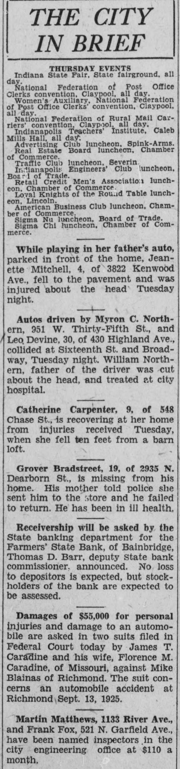 THE CITY IN BRIEF THURSDAY EVENTS Indiana State Fair, State fairground, all day. National Federation of Post Office Clerks convention, Claypool, all day. Women's Auxiliary, National Federation of Post Office Clerks' convention, Claypool, all day. National Federation of Rural Mail Carriers' convention, Claypool, all day. Indianapolis Teachers' Institute, Caleb Mills Hall, all day. Advertising Club luncheon, Spink-Arms. Real Estate Board luncheon, Chamber of Commerce. Traffic Club luncheon, Severin. Indianapolis Engineers' Club luncheon, Board of Trade. Retail Credit Men's Association luncheon. Chamber of Commerce. Loval Knights of the Round Table luncheon, Lincoln. American Business Club luncheon, Chamber of Commerce. Sigma Nu luncheon, Board of Trade. Sigma Chi luncheon, Chamber of Commerce. While playing in her father's auto, parked in front of the home, Jeanette Mitchell, 4, of 3822 Kenwood Ave., fell to the pavement and was injured about the head Tuesday night. Autos driven by Myron C. Northern, 951 W. Thirty-Fifth St., and Leo Devine, 30, of 430 Highland Ave., collided at Sixteenth St. and Broadway, Tuesday night. William Northern, father of the driver was cut about the head, and treated at city hospital. Catherine Carpenter, 9, of 548 Chase St., is recovering at her home from injuries received Tuesday, when she fell ten feet from a barn loft. Grover Bradstreet, 19, of 2935 N. Dearborn St., is missing from his home. His mother told police she sent him to the store and he failed to return. He has been in ill health. Receivership will be asked by the State banking department for the Farmers' State Bank, of Bainbridge, Thomas D. Barr, deputy State bank commissioner. announced. No. loss to depositors is expected, but stockholders of the bank are expected to be assessed. Damages of $55,000 for personal injuries and damage to an automobile are asked in two suits filed in Federal Court today by James T. Caradine and his wife, Florence M. Caradine, of Missouri, against Mike Blainas of Richmond. The suit concerns an automobile accident at Richmond Sept. 13, 1925. Martin Matthews, 1133 River Ave., and Frank Fox, 521 N. Garfield Ave., have been named inspectors in the city engineering office at $110 a month.