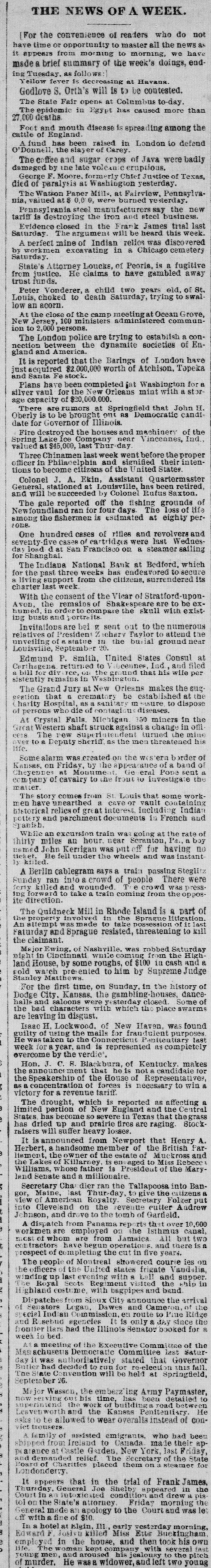 [For the convenience of readers who do not have time or opportunity to master all the news as it appears from morning to morning, we have madea brief summary of the week's doings, ending Tuesday. as follows Yellow fever Is decreasing at Havana. Godlove S. Orth's will is to be contested. The State Fair opens at Columbus to-day. The epidemic in Egypt has caused more than 27,000 deaths Foot and mouth disease is spreading among the of cattle England. fund has been raised in London to defend O'Donnell, the slayer of Carey. The ffee and sugar crops of Java were badly damaged by the late volcan eruptions. George F. Moore. formerly Chief Justice of Texas, died of paralysis at Washington yesterday. The Watson Paper Mills. at Fairview, Pennsylvania, valued at $ 0,0 0, were burned yesterday. Pennsylvania steel manufacturers say the new tariff is destroying the iron and steel business. Evidence closed in the Frank James trial last Saturday The argument will be heard this week. A perfect mine of Indian relios was discovered by workmen excavating in a Chicago cemetery Saturday. State's Attorney Loucks, of Peoria, is a fugitive from justice. He claims to have gambled away trust funds. Peter Vonderer, a child two years eld, of St. Louis, choked to death Saturday, trying to swallow an acorn. At the close of the camp meeting at Ocean Grove, New Jersey, 100 ministers administered communion to 2,000 persons. The London police are trying to establish a connection between the dynamite societies of England and America. It is reported that the Barings of London have just acquired $2,000,000 worth of Atchison. Topeka Fe stock. Santa and Plans have been completed int Washington for silver vaul for the New Orleans mint with a storage capacity of $20,000,000. There are rumors at Springfield that John H. Oberly is to be brought out as Democratic candidate for Governor of Illinois. Fire destroyed the houses and machinery of the Spring Lake Ice Company near Vincennes, Ind., valued at $45,000, last Thur-day Three Chinamen last week went before the proper officer in Philage and signified their intentions to become citizens of the United States. Colonel J. A. Ekin, Assistant Quartermaster General. stationed at Louisville, has been retired, and will besucceeded by Colonel Rufus Saxton. The gale reported off the fishing grounds of Newfoundland ran for four days. The loss of life among the fishermen is estimated at eighty per!one. One hundred cases of rifles and revolvers and seventy five cases of cartridges were last Wednesday load d at San Francisco OD. a steamer sailing for Shanghai. The Indiana National Bank at Bedford, which for the past three weeks has endeavored to secure a living support from the citizens, surrendered its charter last week. With the consent of the Vicar of Stratford-uponAvon, the remains of Shakespeare are to be exhumed, in order to compare the skull with existing busts and portraits. Invitations are bei ? sent out to the numerous relatives of President Z chary Taylor to attend the unveiling of statue in the burial ground near Louisville, September 20. Edmund P. Smith, United States Consul at Certhagena returned to lucennes Ind and filed a bill for div ree, the gr und that his wife per sistently remains in Washington. The Grand Jury at New Orleans makes the sug. sestion that & crematory be estab ished at the Charity Hospital, as sanitary m asure to dispose of persons who die of contagio u diseases. At Crystal Falls. Michigan 150 miners in the Great Western shaft struckagainst a change in offi 0018 The new Superintendent turned the mine over to a Deputy Sheriff as the men threatened his life. Some alarm was created on the b order of Kansas, on Friday, by he appea ance of a band of Cheyennes at Monume Ge eral Pone sent a company of cavalry to the front to investigate the matter The story comes from St. Louis that some workmen have unearthed a cave or vault containing historical relies of great interest. including Indian pottery and parchment documents in French and Syanish. While an excursion train was going at the rate of thirty miles an hour near Scranton, Pa. a boy named John Kerrigan was put iff for having no ticket. He fell under the wheels and was instant ly killed. A Berlin cablegram says train passing Steglitz Sunday ran into a crowd of people There were forty killed and wounded Te crowd was press10g forward to take a train coming from the opposite direction. The Quidneck Mill in Rhode Island is a part of the property involved the Sprague litigation. An attempt was made to take possession of it last Faturday and Sprague resisted, threatening to kill the claimant. Major Ewing, of Nashville. was robbed Saturday night in Cincinnati while coming from the Highland House, by some roughs, of $100 in cash and a gold watch presented to him by Supreme Judge Stanley Matthews. For the first time, on Sunday, in the history of Dodge City. Kansas, the gambling-houses, dancehalls and saloons were esterday closed. Some of the bad characters with which the place swarms are leaving in disgust. Issac H. Lockwood. of New Haven, was found guilty of using the mails for frandulent purposes. He was taken to the Connecticut Penitentiary last week for year. and is represented as completely overcome by the verdic'. Hon. J. C. S. Blackbura, of Kentucky. makes the announce ment that he is not candidaie for the Speakership of the House of Representatives, as concentration of forces is necessary to win a victory for & revenue tariff The drought, which is reported as affecting a limited pertion of New England and the Central States has become so severe in Texas that thegrass has dried up and prairie fires are raging. Stockraisers will suffer heavy losses. It is announced from Newport that Henry A. Herbert, handsome member of the British Parlisment, the owner of the estate of Muckross and the Lakesof Killarney is envaged to Miss Rebece Williams, whose father is President of the Maryland Senate and a millionaire. Secretary Cha 