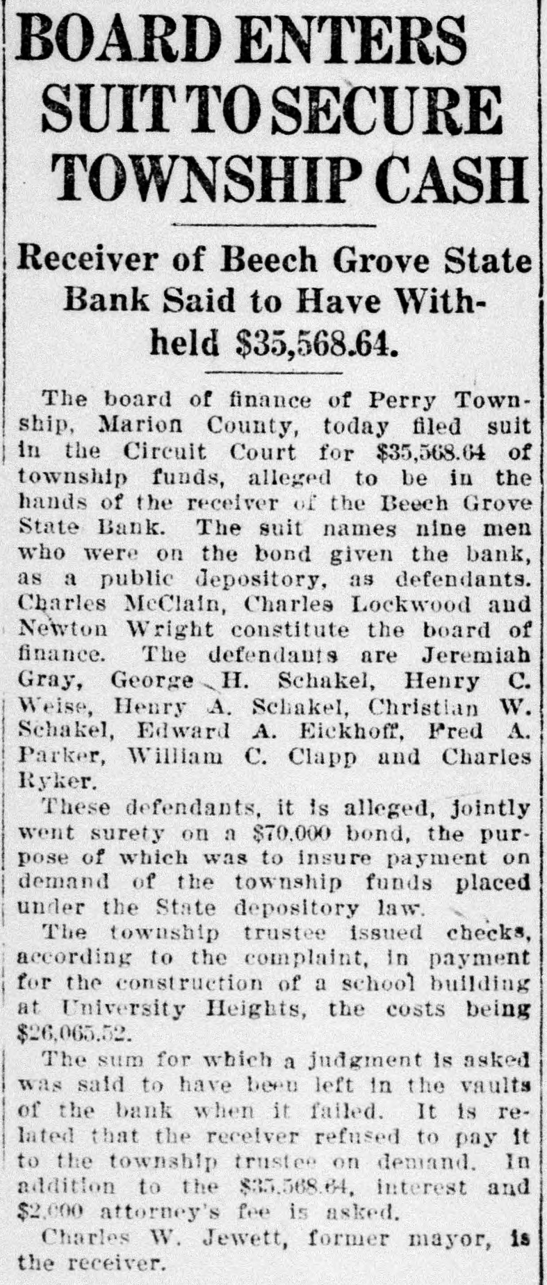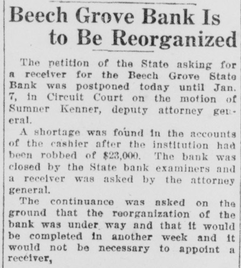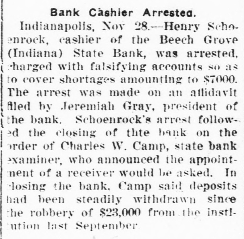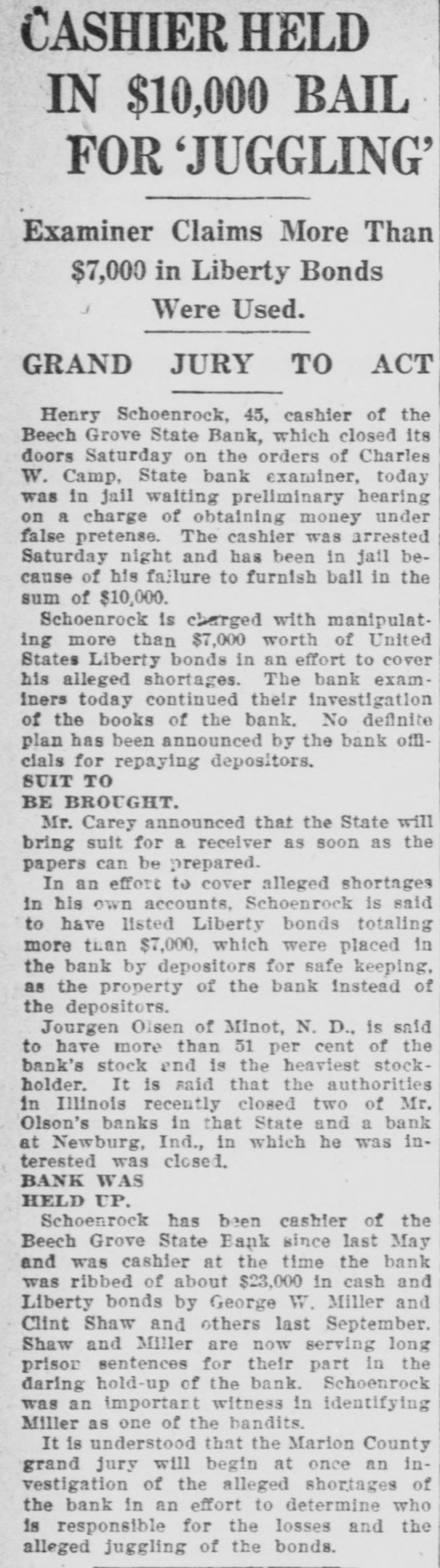 CASHIER HELD IN $10,000 BAIL FOR 'JUGGLING' Examiner Claims More Than $7,000 in Liberty Bonds Were Used. GRAND JURY TO ACT Henry Schoenrock, 45, cashier of the Beech Grove State Bank, which closed its doors Saturday on the orders of Charles W. Camp, State bank examiner, today was in jail waiting preliminary hearing on a charge of obtaining money under false pretense. The cashier was arrested Saturday night and has been in jail because of his failure to furnish ball in the sum of $10,000. Schoenrock is charged with manipulating more than $7,000 worth of United States Liberty bonds in an effort to cover his alleged shortages. The bank examiners today continued their investigation of the books of the bank. No definite plan has been announced by the bank offlcials for repaying depositors. SUIT TO BE BROUGHT. Mr. Carey announced that the State will bring suit for a receiver as soon as the papers can be prepared. In an effort to cover alleged shortages in his own accounts, Schoenrock is said to have listed Liberty bonds totaling more tian $7,000, which were placed in the bank by depositors for safe keeping, as the property of the bank instead of the depositors. Jourgen Olsen of Minot, N. D., is said to have more than 51 per cent of the bank's stock end is the heaviest stockholder. It is said that the authorities in Illinois recently closed two of Mr. Olson's banks in that State and a bank at Newburg, Ind., in which he was interested was closed. BANK WAS HELD UP. Schoenrock has been cashier of the Beech Grove State Bank since last May and was cashier at the time the bank was ribbed of about $23,000 in cash and Liberty bonds by George W. Miller and Clint Shaw and others last September. Shaw and Miller are now serving long prisor sentences for their part in the daring hold-up of the bank. Schoenrock was an important witness in identifying Miller as one of the bandits. It is understood that the Marion County grand jury will begin at once an investigation of the alleged shortages of the bank in an effort to determine who is responsible for the losses and the alleged juggling of the bonds.