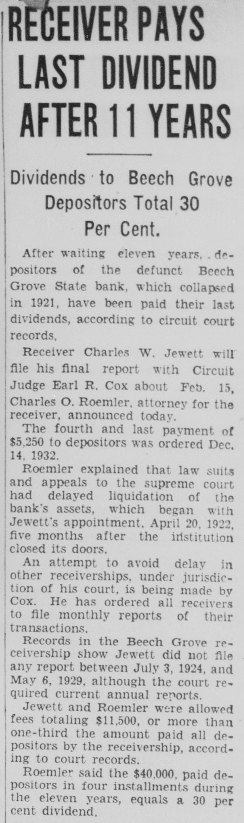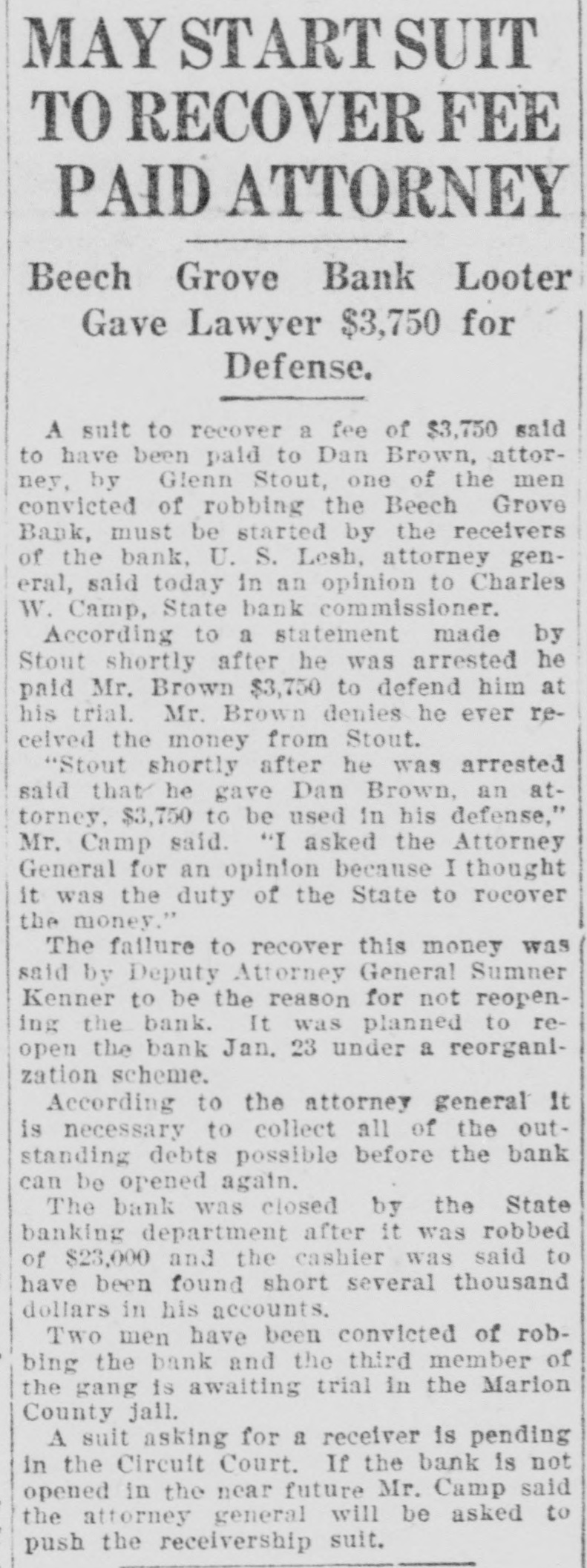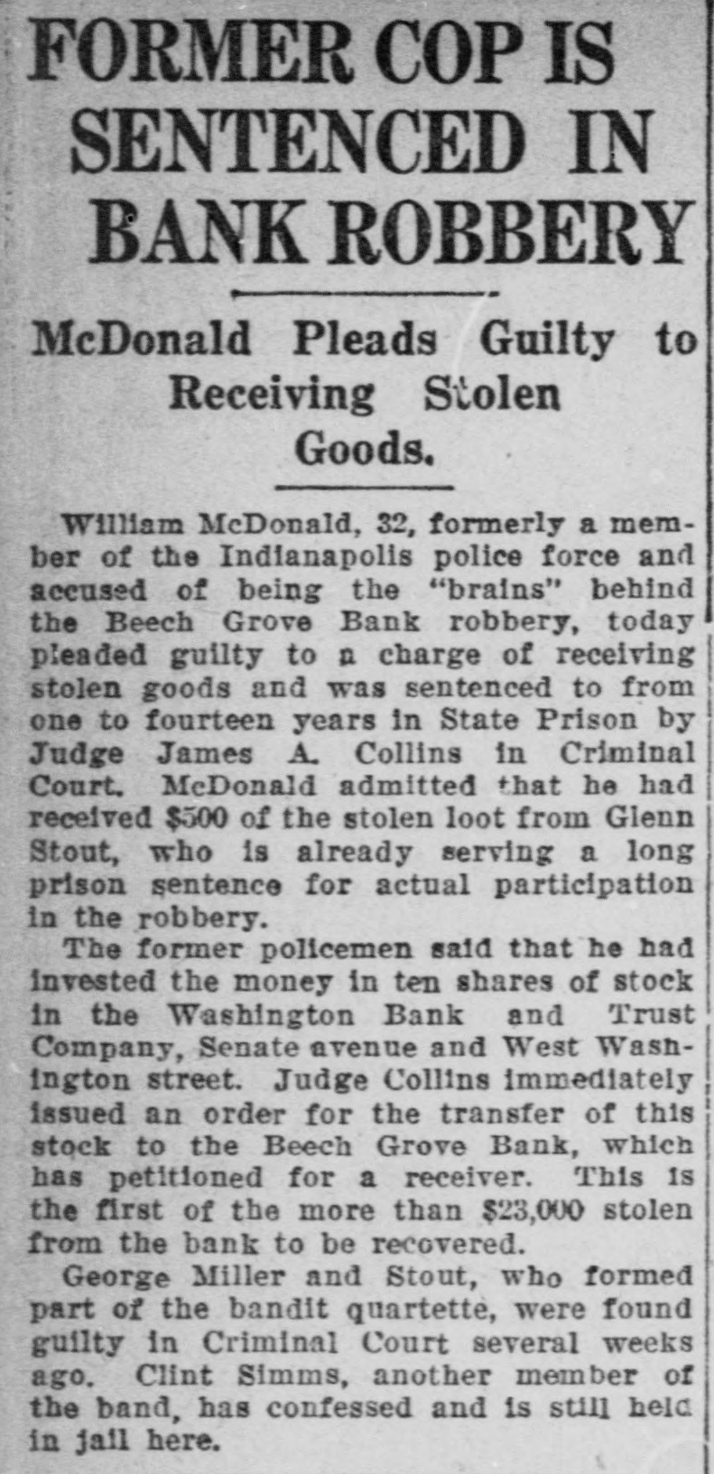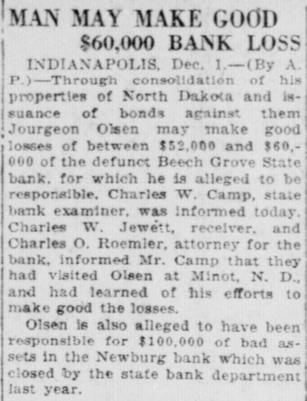 CASHIER HELD IN $10,000 BAIL FOR 'JUGGLING' Examiner Claims More Than $7,000 in Liberty Bonds Were Used. GRAND JURY TO ACT Henry Schoenrock, 45, cashier of the Beech Grove State Bank, which closed its doors Saturday on the orders of Charles W. Camp, State bank examiner, today was in jail waiting preliminary hearing on a charge of obtaining money under false pretense. The cashier was arrested Saturday night and has been in jail because of his failure to furnish ball in the sum of $10,000. Schoenrock is charged with manipulating more than $7,000 worth of United States Liberty bonds in an effort to cover his alleged shortages. The bank examiners today continued their investigation of the books of the bank. No definite plan has been announced by the bank offlcials for repaying depositors. SUIT TO BE BROUGHT. Mr. Carey announced that the State will bring suit for a receiver as soon as the papers can be prepared. In an effort to cover alleged shortages in his own accounts, Schoenrock is said to have listed Liberty bonds totaling more tian $7,000, which were placed in the bank by depositors for safe keeping, as the property of the bank instead of the depositors. Jourgen Olsen of Minot, N. D., is said to have more than 51 per cent of the bank's stock end is the heaviest stockholder. It is said that the authorities in Illinois recently closed two of Mr. Olson's banks in that State and a bank at Newburg, Ind., in which he was interested was closed. BANK WAS HELD UP. Schoenrock has been cashier of the Beech Grove State Bank since last May and was cashier at the time the bank was ribbed of about $23,000 in cash and Liberty bonds by George W. Miller and Clint Shaw and others last September. Shaw and Miller are now serving long prisor sentences for their part in the daring hold-up of the bank. Schoenrock was an important witness in identifying Miller as one of the bandits. It is understood that the Marion County grand jury will begin at once an investigation of the alleged shortages of the bank in an effort to determine who is responsible for the losses and the alleged juggling of the bonds.