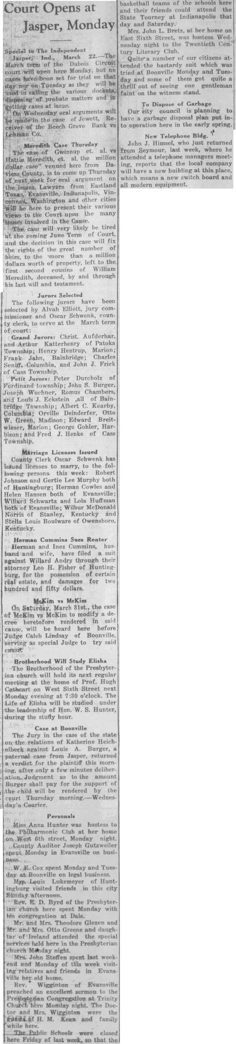 Court Opens at Monday Jasper, Special Independent Ind., March Dubois Circuit March term of the here Monday, but no will open cases set for trial on that will be on Tuesday as they the various dockets, calling matters and probate cases at issue. On Wednesday oral arguments will of Jewett, made'in the Grove Bank of the Beech ceiver Lehman Co. Moredith Case Thursday The Gwinnup et. al. al. the million Hattie Meredith, et. here from Dadollar case" venued County, is to come up Thursday of for oral argument on from Eastland issues. Lawyers Texas, Vincennes, Washington and other cities their various will be here to present views to the Court upon the many issues involved in the Cause The case will very likely be tired the coming June Term of Court, and the decision in this case will fix the rights of the great number of than million heirs, to the dollars worth of property, left to the of William first second cousins Meredith, deceased, by and through his last will and testament. Jurors Selected The following jurors have been selected by Alvah Elliott, jury commissioner and Oscar Schwenk, counclerk, to serve at the March term Grand Jurors: Christ. Aufderhar, and Arthur Katterhenry of Patoka Township; Henry Hentrup, Marion; Frank Jahn, Bainbridge; Charles Seniff, Columbia, and John J. Frick of Cass Township. Jurors: Peter Durcholz of Petit Ferdinand township; John S. Burger, Joseph Wuchner, Romus Chambers, and Louis Eckstein all of Bainbridge Township; Albert C. Kearby, Columbia; Orville Deinderfer, Otto Green, Madison; Edward Breitwieser, Marion; George Gohler, Harbison: and Fred J. Henke of Cass Township. Marriage Licenses Issued County Clerk Oscar Schwenk has issued licenses to marry, to the following persons this week: Robert Johnson and Gertie Lee Murphy both of Huntingburg; Herman Cowles and Helen Hansen both of Evansville; Willard Schwartz and Lola Huffman both of Evansville; Wilbur McDonald Norris of Stanley, Kentucky and Stella Louis Boulware of Owensboro, Kentucky. Herman Cummins Sues Renter Herman and Inez Cummins, husband and wife, have filed suit against Willard Andry through their attorney Leo H. Fisher of Huntingburg, for the possession of certain real estate, and damages for two hundred and fifty dollars. McKim McKim On Saturday, March 31st., the case of McKim vs McKim to modify decree heretofore rendered in said cause, will be heard here before Judge Caleb Lindsay of Boonville, serving as special Judge to try said cause. Brotherhood Will Study Elisha The Brotherhood of the Presbyterian church will hold its next regular meeting at the home of Prof. Hugh Cathcart on West Sixth Street next Monday evening at 7:30 o'clock. The Life of Elisha will be studied under the leadership of Hon. W. S. Hunter, during the study hour. Case at Boonville The Jury in the case of the state the relations of Katherine Heichelbeck against Louis A. Burger, paternal case from Jasper, returned verdict for the plaintiff this morning, after only few minutes deliberas to the amount Burger shall pay for the support of the child will be rendered by the court Thursday Courier. Personals Anna Hunter was hostess to the Philharmonic Club at her home 6th street, Monday night. County Auditor Joseph Gutzweiler spent Monday in Evansville on busiCox spent Monday and Tuesday at Boonville on legal business. Lukemeyer of Huntingburg visited friends in this city Sunday afternoon. Rev. E. Byrd of the Presbyterian church here spent Monday with his congregation at Dale. Mr. and Mrs. Theodore Glezen and Mr. and Mrs. Otto Greene and daughattended the special services held here in the Presbyterian church Menday night. Mrs. John Steffen spent last weekend and Monday of this week visitand friends in Evanshome. Rev. Wigginton of Evansville preached an excellent sermon to the Congregation at Trinity Church Monday night. The Doctor and Mrs. Wigginton were the H. M. Kean and family while here. Schools were closed here Friday of last week, SO that the basketball teams of the schools here and their friends could attend the State Tourney at Indianapolis that day and Saturday. Mrs. John Bretz, at her home on East Sixth Street, was hostess Wednesday night to the Twentieth CenLiterary Club. tury Quite"a number of our citizens attended the bastardy suit which was tried at Boonville Monday and Tuesday and some of them got quite thrill out of seeing one gentleman faint the witness stand. on To Dispose of Garbage Our city council is planning to have garbage disposal plan put into operation here in the early spring. New Telephone Bldg. John Himsel, who just returned from Seymour, last week, where he attended telephone managers meeting, reports that the local company will have new building this place, which means a new switch board and all modern equipment.
