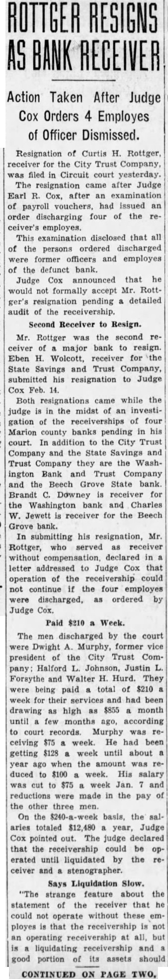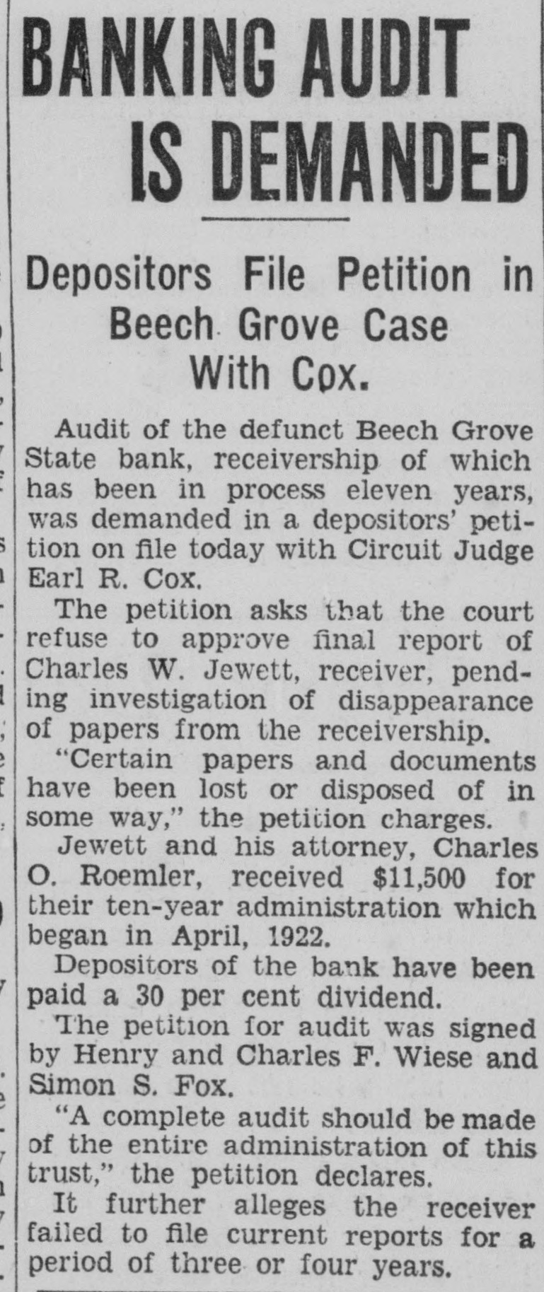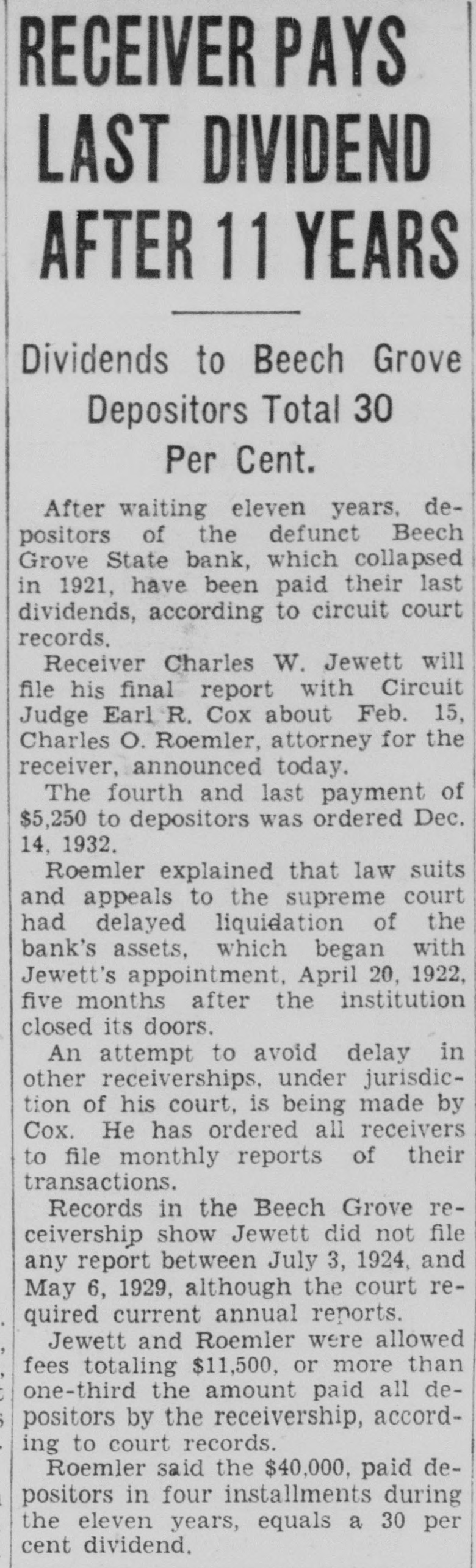 RECEIVER PAYS LAST DIVIDEND AFTER 11 YEARS Dividends to Beech Grove Depositors Total 30 Per Cent. After waiting eleven years, depositors of the defunct Beech Grove State bank, which collapsed in 1921, have been paid their last dividends, according to circuit court records. Receiver Charles W. Jewett will file his final report with Circuit Judge Earl R. Cox about Feb. 15, Charles O. Roemler, attorney for the receiver, announced today. The fourth and last payment of $5,250 to depositors was ordered Dec. 14, 1932. Roemler explained that law suits and appeals to the supreme court had delayed liquidation of the bank's assets, which began with Jewett's appointment, April 20, 1922, five months after the institution closed its doors. An attempt to avoid delay in other receiverships, under jurisdiction of his court, is being made by Cox. He has ordered all receivers to file monthly reports of their transactions. Records in the Beech Grove receivership show Jewett did not file any report between July 3, 1924, and May 6, 1929, although the court required current annual reports. Jewett and Roemler were allowed fees totaling $11,500, or more than one-third the amount paid all depositors by the receivership, according to court records. Roemler said the $40,000, paid depositors in four installments during the eleven years, equals a 30 per cent dividend.
