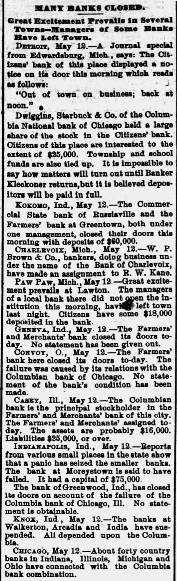 MANY BANK FAILURES. Panic Stricken Bankers in Indiana Country Towns. DRAGGED DOWN BY THE COLUMBIA. The Panic Spreads to Michigan and Ohio Banks, and Several Suspensions Are Added to the List in These States-Pecullar Methods of the Columbia Bank. May 13.-The failure of the a Columbia CHICAGO, National bank has disclosed of shystering without a parallel and in system American banking. The president to of the Columbia is shown have manager organized about fifty small concerns and insignificant points in Indiana of at all of which were correspondents likely Ohio, broken bank, and it is scarcely the the that of them will survive. But litany were at places where there was be banks business the moral effect is likely to The tle serious than the actual business losses. in Columbia more had very little chiefly Chicago, and such as it had was were with customers who, like the bank, the without commercial standing. Hence business was not felt in reputable other failure and had it occurred at any half circles, time it would have been forgotten in an hour. PORTLAND, Ind., May 13.-A courier the Dunkirk announces the failure of confrom Dunkirk bank, which is owned and by Dwiggins, Starbuck & Co., filed of trolled Chicago. Attachments were at once to and deputy sheriff left immediately The a all the available property. the levy on has failed for at least $75,000, and bank may reach $100,000. The firm con- of trolling amount this bank owns a number and these are reported to havegone enothers, to the wall. The Geneva bank of their terprise also has failed. INDIANAPOLIS, Ind. May 13.-State Audi- ComHenderson was notified that the could tor mercial State bank, of Russiaville, its demands. The Commercial in not meet is one of about twenty banks Indiana bank that are thought to be connected as with the Columbia National. Perhaps to the private banks are also related many Chicago concern to some extent. Reports show other small places in the state banks. that from a panic has seized the smaller county, bank at Brookston, White (o statesuspended The yesterday afternoon. made. It of its condition has been ment controlled by the Columbia National. was banks of the Columbia Nationalstring said to The Moreystown and Greenwood are liabilities at have also failed, the latter with amounting to $60,000. The Moreystown bank is of considerable importance, having a capital addition of $75,000. to the above the following bank, In are reported: Citizens' suspensions Ind. Bank of Spiceland, SpiceHebron, Ind.; Monroeville bank, Monroeville, Ind., land, Commercial bank, Norristown, these Ind.; Citizens' bank, Knox, Ind. All of were and branches of the Columbia National Chicago. INDIANAPOLIS, May B.-The directors that the Capital National bank claim and of has been no loss on discounts, dollar. there not a department has lost a that bank, they say, is more than solvent. The will ask the examiner to permit They resumption after an examination. FORT WAYNE, Ind., May 13, -News Mer- of suspension of the Farmers' and reached chants' the bank at Geneva, Ind., has the here. It was the oldest institution of kind in the town. CINCINNATI, O., May 13. -The private & firm of Dwiggins, Starbuck failed. banking at Williamsburgh, O., has of the Co., failure is due to the failure Mr. The Columbia bank, of Chicago, of which is was cashier. About $8,000 the Dwiggins the Williamsburg bank from will due Columbia, all of which, it is thought, Williamslost. The postmaster at be ordered the arrest, for alleged burgh, embezzlement, of Lawrence G. Good, cusexpert accountant. He was taken in tody. O., May 13.-The Farmers' CONVOY, of this place, has closed its doors, bank caused by its relations with the Columbia National. EDWARDSBURG, Mich., May 13. -The Cit- its bank, of this place, has closed izens' About $25,000 of local deposits, todoors. gether with township and school funds, Chiare re affected. It was a branch of the cago Columbia. RICHLAND, Mich., May 13. -The Union a branch of the Columbia National bank, bank, of Chicago, has closed its doors. Cashier Watts says that the depositors will be paid in full and the bank running again in two or three days. CHARLEVOIX, Mich., May 13.-W. P. & Co., bankers, doing business unBrown the name of the Bank of Charlevoix, Kane. have der made an assignment to R. W. PAW PAW, Mich., May 13. Great excitement prevails at Lawton. The managers the in of a local bank there did not open town stitution yesterday, having left Thursday night. Citizens have about$18,000 deposited in the bank. LAWTON, Mich., May 13.-The American It of this city has closed its doors. bank controlled by the Columbia National business bank is of Chicago. Nearly every in the city is involved, besides depositors. many farmers man and others who were The deposits amount to about $30,000. SAN JOSE, Cal., May -The liabilities to the Santa Clara bank are now stated by of $300,000. Assurances had been given the be officers of the bank that the depositors would be paid in full