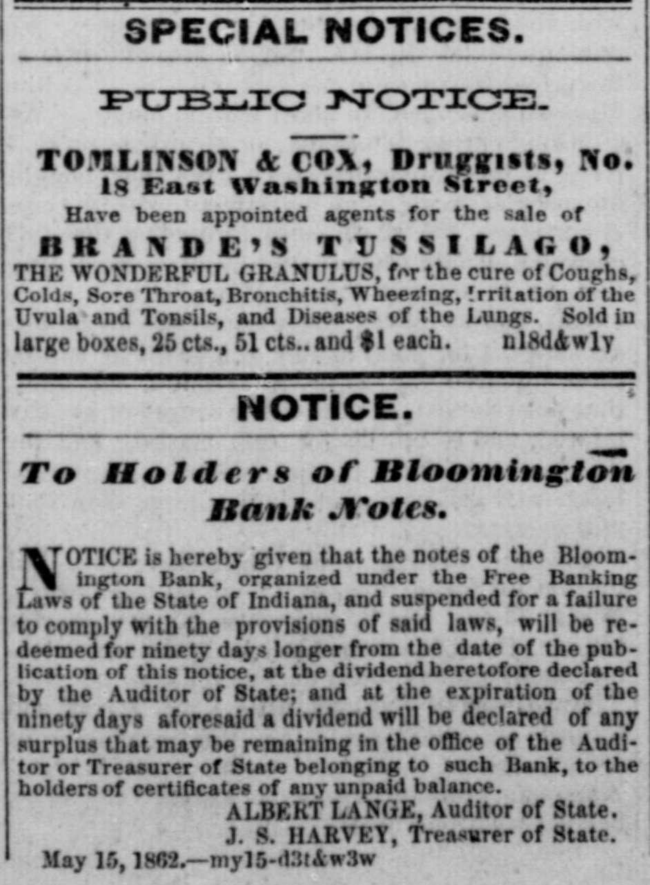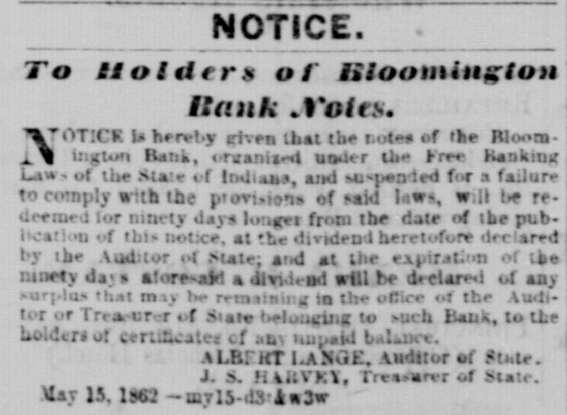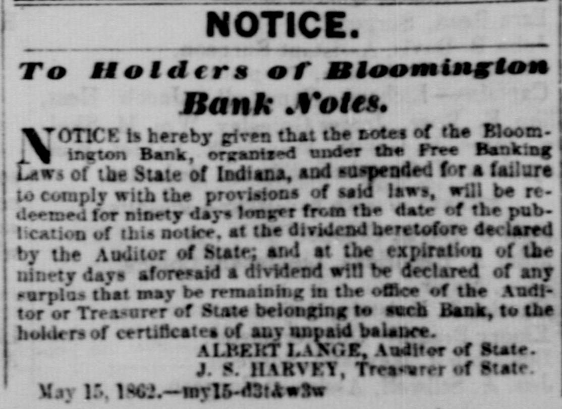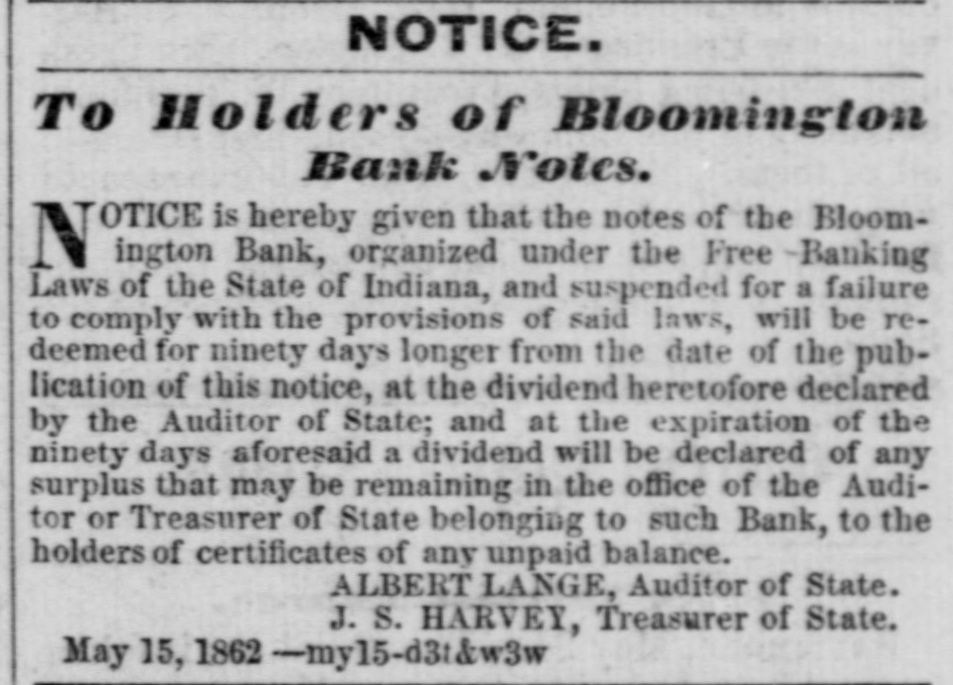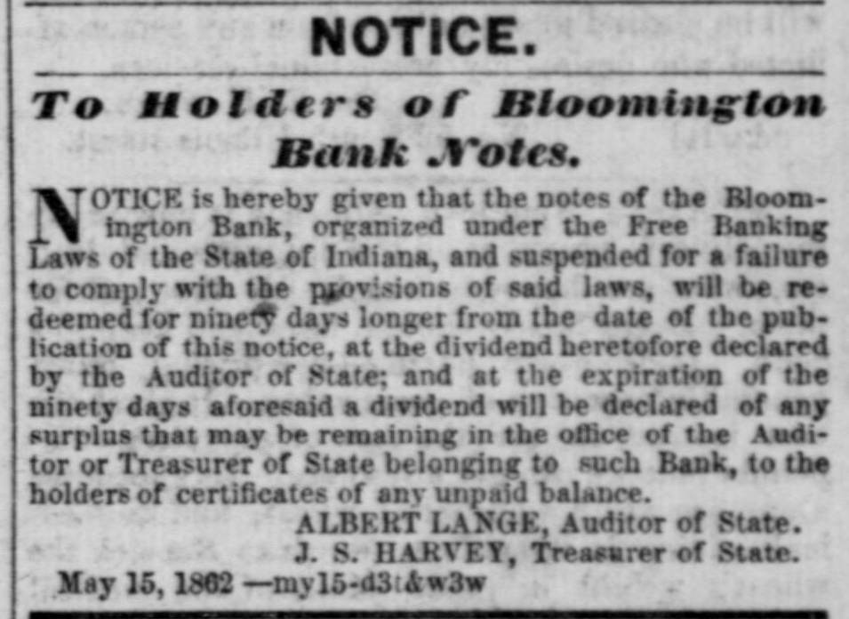 NOTICE. To Holders of Rioomington Bank Notes. TOTICE is hereby given that the notes of the Bloomington Bank, organized under the Free Banking Laws of the State of Indiana, and suspended for a failure to comply with the provisions of said laws, will be redeemed for ninety days longer from the date of the publication of this notice, at the dividend heretofore declared by the Auditor of State; and at the expiration of the ninety days aforesaid a dividend will be declared of any surplas that may be remaining in the office of the Auditor or Treasurer of State belonging to such Bank, to the holders of certificates of any unpaid balance. ALBERT LANGE, Auditor of State. J. S. HARVEY, Treasurer of State. May 15. 1862 -my15-d3:kw3w