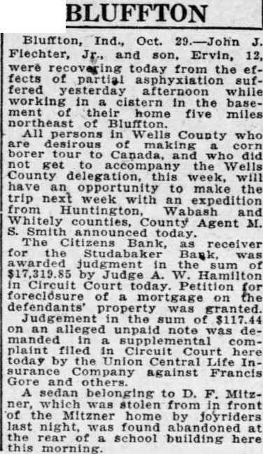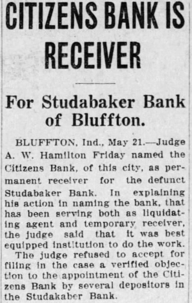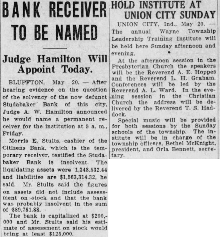 HOLD INSTITUTE AT BANK RECEIVER UNION CITY SUNDAY UNION CITY, Ind., May 20. The annual Wayne Township TO BE NAMED Leadership Training Institute will Judge Hamilton Will Appoint Today. BLUFFTON, May 20. After hearing evidence on the question of the solvency of the now defunct Studabaker Bank of this city, Judge A. W. Hamilton announced he would name a permanent receiver for the institution at 9 a. m., Friday. Morris E. Stults, cashier of the Citizens Bank. which is the temporary receiver. testified the Studabaker Bank is insolvent. The liquidating assets were 1,348,532.44 and liabilities are $1,563,314.32, he said. Mr. Stults said the figures on assets did not include assessment on stock and that the bank was probably insolvent in the sum of $89,781.88. The bank is capitalized at $200,000 and Mr. Stults said his estimate of assessment on stock would bring at least $125,000. be held here Sunday afternoon and At the afternoon session in the Presbyterian Church the speakers will be the Reverend A. E. Hoppes and the Reverend L. H. Graham. Conferences will be led by the Reverend A. L. Ward. In the evening session in the Christian Church the address will be delivered by the Reverend T. S. Haddock. Special music will be provided for both sessions by the Sunday schools of the township. The institute will be in charge of the township officers, Bethel McKnight, president, and Orla Bennett, secretary.