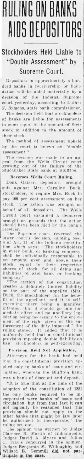 RULING ON BANKS AIDS DEPOSITORS Stockholders Held Liable to "Double Assessment" by Supreme Court. Depositors in approximately hundred banks In receivership or liquidation will be aided materially by decision of the Indiana Supreme court according to Luther F. Symons, bank The held that stockholders of banks are liable for assessments in sums equal to the amount of their stock addition to the amount of their The method of upheld by the court is known as "double The decision made in an peal from the Wells Circuit court growing out the failure of the Studabaker State bank at Bluffton. Reverses Wells Court Ruling. Dona Gaiser, depositor, brought suit against Mrs. Caroline to require Mrs. Buck to pay 100 per cent on her stock. The action brought on behalf of all depositors. The Wells Circuit court sustained demurrer brought on grounds that the action should been filed by the bank's The court reversed the quoting Sec. Art. of the Indiana tion which "The in every bank or banking company shall be individually responsible to an and above their to their respective shares for all debts and liabilities of said bank or banking company section of the constitution creates definitely limited liability on the part of the appellee (Mrs. Buck the stockholder) for the benefit the it selfbeing manifest intention that should go into mediate effect and no ancillary legislation to the enjoyment of right given or the enforcement of the duty the ruling It added that is uniformly held that liability stockholders is executing. Provision Held Not Applicable. Attorneys for the bank had held that the constitutional provision applied only to banks of issue and circulation. whereas the Bluffton bank bank of discount and deposit. "It is true that at the time of the adoption of the constitution of 1851 the only banks required to be incorporated banks of issue and but from that fact can not logically be reasoned that this provision should not apply to the other banks that might by law later be to the set The was written by Judge Clarence Martin of Judges David Myers and Julius in the opinion Judges Benjamin Willoughby and Willard B. did not participate in the case.