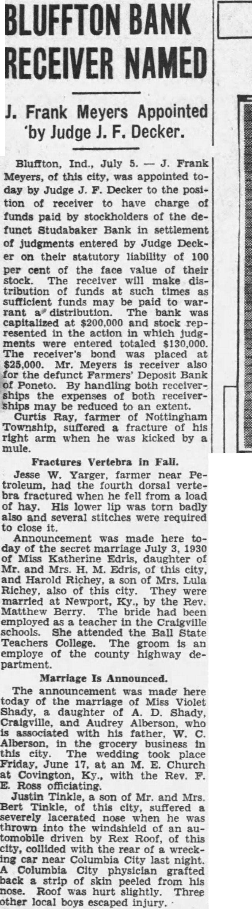 BLUFFTON RECEIVER NAMED Frank Meyers Appointed by Judge Decker. Bluffton, Ind., July Frank Meyers, of this city, was appointed today by Judge Decker to the position of receiver to have charge of funds paid by stockholders of the defunct Studabaker Bank in settlement of judgments entered by Judge Deckon their statutory liability of 100 per cent the face value of their stock. The receiver will make distribution funds at such times sufficient funds may paid to rant distribution. The bank capitalized and stock represented in action which judgments were entered totaled The receiver's bond was placed Mr. Meyers is receiver also the defunct Farmers' Deposit Bank Poneto. By handling both receiverships the expenses both receivermay reduced to an extent. Curtis Ray, farmer of Nottingham Township, suffered fracture his right when he was kicked by mule. Fractures Vertebra in Fall. Jesse W. Yarger, farmer near Petroleum, had the fourth dorsal vertefractured when he fell from load of hay. His lower lip was torn badly also and several stitches were required to close was made here today of the secret July 1930 Miss Edris, daughter and Mrs. H. Edris, of this city and Harold son Mrs. Lula of this city. They married the Rev. Matthew The bride had been employed teacher the schools. She attended the Ball State Teachers College. The groom employe the county highway partment. Marriage Is Announced. The was made here today of the marriage Miss Violet Shady, Shady, Craigville, and who associated his father, W. grocery city wedding took place Friday, June at an Church at Covington, with the Rev. Ross officiating. Justin Tinkle, of Mr. and Mrs. Bert Tinkle, this city, suffered severely lacerated nose he was thrown the windshield tomobile driven by Rex Roof, of this collided with the rear of wreckcar near Columbia City last night. Columbia City physician grafted back skin peeled from his nose. Roof was hurt slightly. Three other local boys escaped injury.