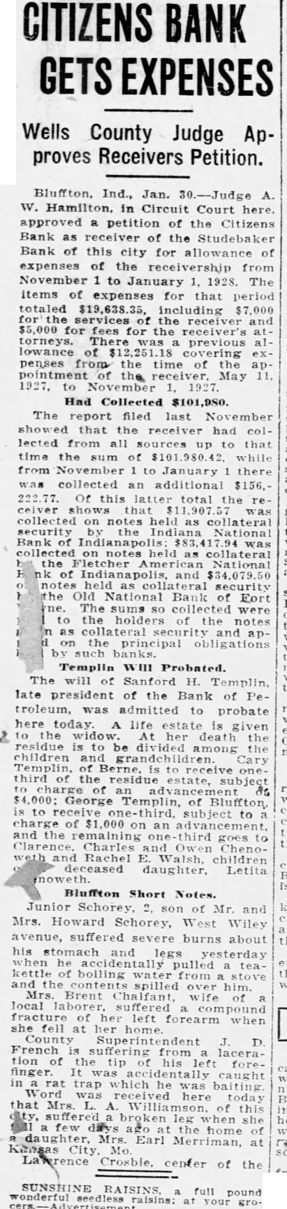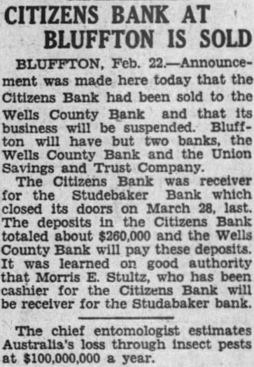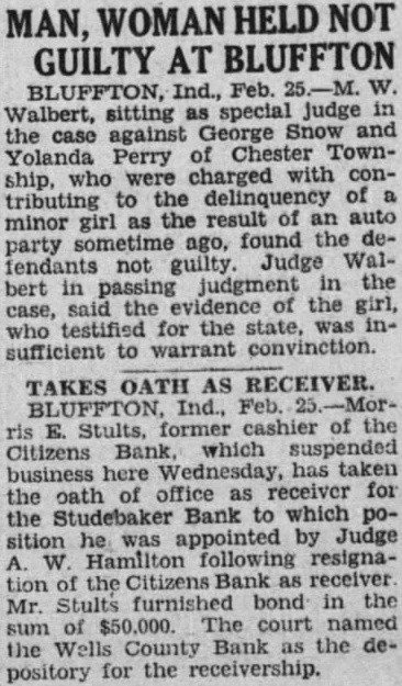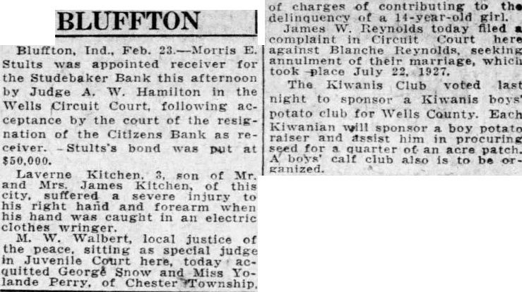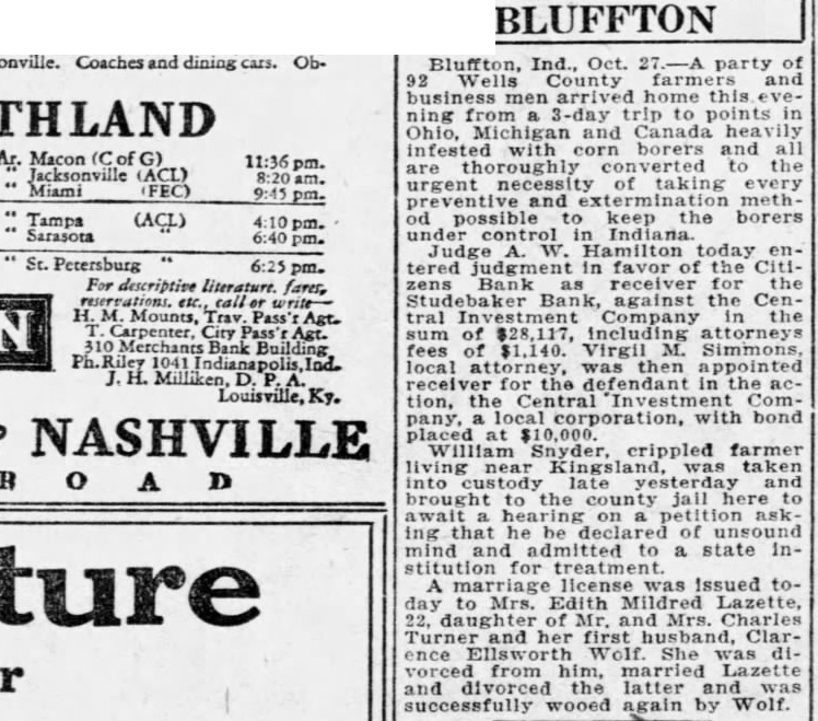 BLUFFTON Bluffton, Ind., Oct. party of 92 Wells County farmers and business men arrived home this ning from 3-day trip to points in Ohio, Michigan and Canada heavily infested with corn borers and all Ar. Macon (Cof G) are thoroughly converted the Jacksonville (ACL) am. urgent necessity of taking every Miami (FEC) Tampa (ACL) od possible to keep the borers Sarasota under control in Indiana. Judge W. Hamilton today enSt. Petersburg 6:25 pm. tered judgment in favor of the Citidescriptive literature. fares, zens Bank as receiver for the Studebaker Bank, against the CenH.M. Mounts, tral Investment Company in the Carpenter, City sum of $28,117, including attorneys Merchants Bank Building fees of $1,140. Virgil M. Simmons, Ph.Riley local attorney, was then appointed Milliken, for the defendant in the Louisville, Ky. tion, the Central Investment Company, a local corporation, with bond placed at $10,000. William Snyder, crippled farmer living near Kingsland, taken B A D into custody late yesterday and brought to the county jall here to await hearing on petition asking that he be declared of unsound mind and admitted to a state institution for A license Issued today to Mrs. Edith Mildred Lazette, 22. daughter of and Mrs. Charles Turner and her first husband, Clarence Ellsworth Wolf. She was divorced from him, married Lazette and divorced the latter and successfully wooed again by Wolf.