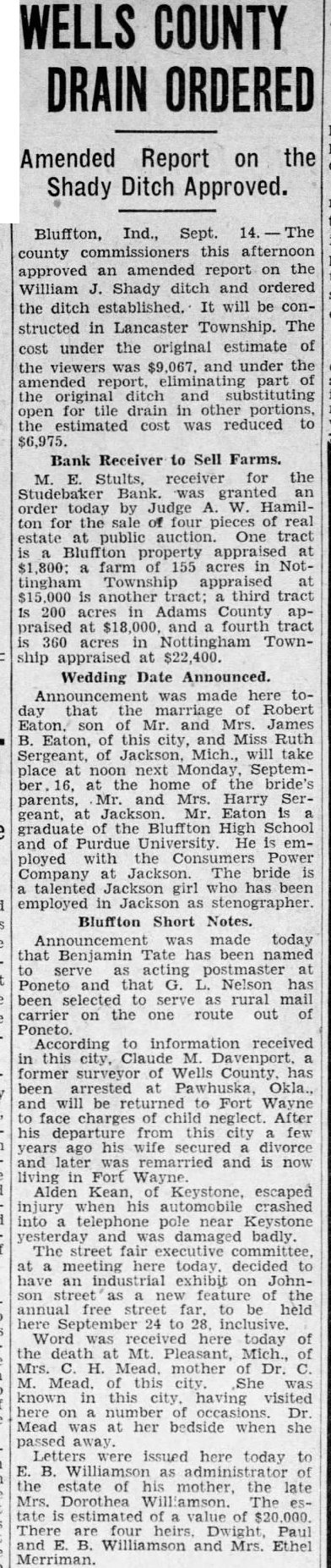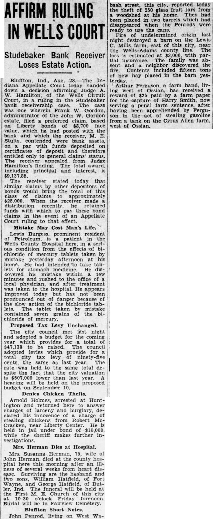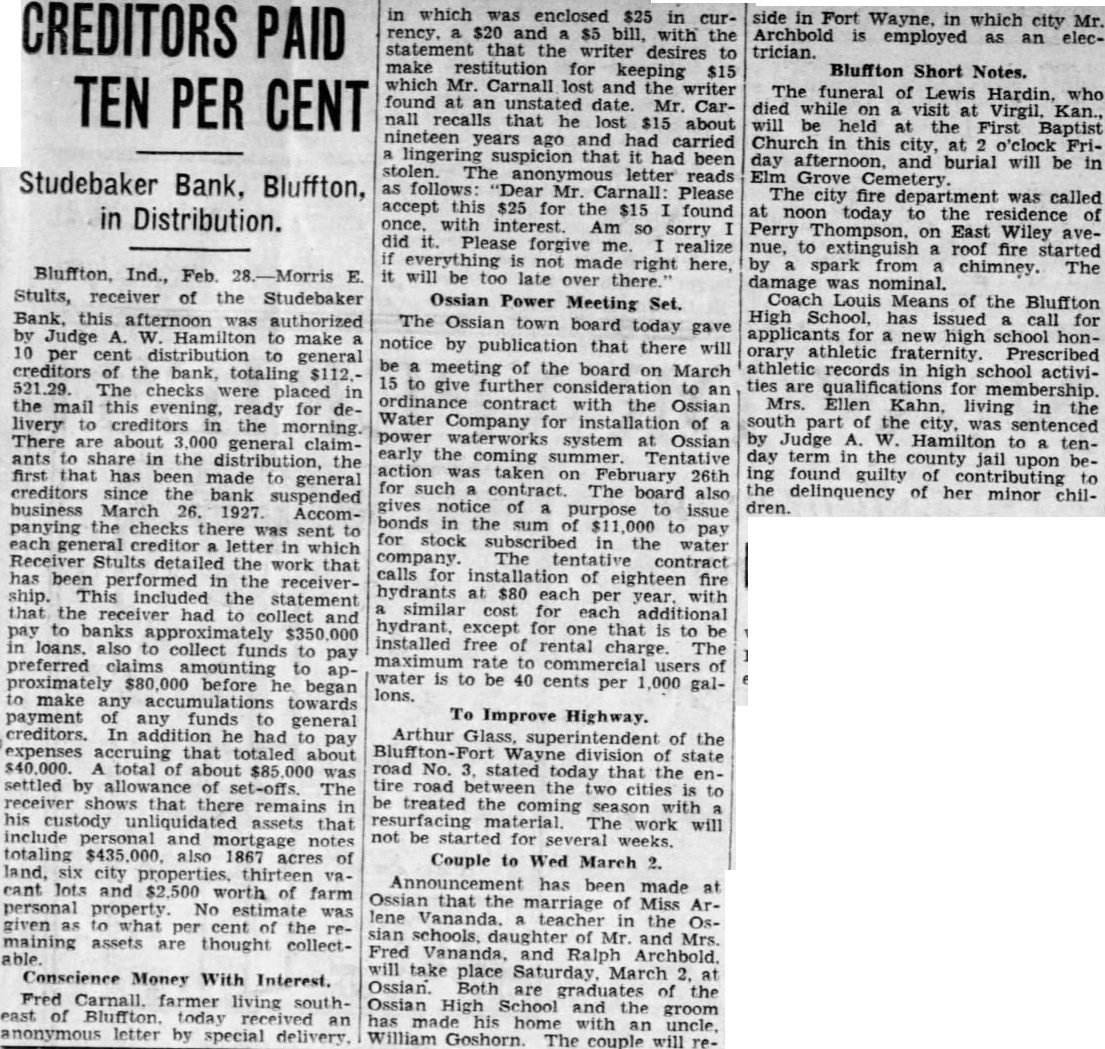 CREDITORS PAID TEN PER CENT Studebaker Bank, Bluffton, in Distribution. Bluffton, Ind., Feb. 28.-Morris E. Stults, receiver of the Studebaker Bank, this afternoon was authorized by Judge A. W. Hamilton to make 10 per cent distribution to general creditors of the bank, totaling $112.521.29. The checks were placed in the mail this evening, ready for delivery to creditors in the morning. There are about 3,000 general claimants to share in the distribution, the first that has been made to general creditors since the bank suspended business March 26. 1927. Accompanying the checks there was sent to each general creditor letter in which Receiver Stults detailed the work that has been performed in the receivership. This included the statement that the receiver had to collect and pay to banks approximately $350,000 loans. also to collect funds to pay preferred claims amounting to approximately $80,000 before he began make any accumulations towards payment of any funds to general creditors. In addition he had to pay expenses accruing that totaled about $40,000. A total of about $85 000 was settled by allowance of set-offs. The receiver shows that there remains in his custody unliquidated assets that include personal and mortgage notes totaling $435,000. also 1867 acres of land, six city properties. thirteen vacant lots and $2,500 worth of farm personal property No estimate was given as to what per cent of the remaining assets are thought collectable. Conscience Money With Interest. Fred Carnall. farmer living southeast of Bluffton. today received an anonymous letter by special delivery. in which was enclosed $25 in currency. $20 and $5 bill. with the statement that the writer desires to make restitution for keeping $15 which Mr. Carnall lost and the writer found at an unstated date. Mr. Carnall recalls that he lost $15 about nineteen years ago and had carried lingering suspicion that it had been stolen. The anonymous letter reads as follows: "Dear Mr. Carnall: Please accept this $25 for the $15 I found once. with interest. Am so sorry I did it. Please forgive me. realize if everything is not made right here, it will be too late over there Ossian Power Meeting Set. The Ossian town board today gave notice by publication that there will be a meeting of the board on March 15 to give further consideration to an ordinance contract with the Ossian Water Company for installation of a power waterworks system at Ossian early the coming summer. Tentative action was taken on February 26th for such contract. The board also gives notice of purpose to issue bonds in the sum of $11,000 to pay for stock subscribed in the water company The tentative contract calls for installation of eighteen fire hydrants at $80 each per year. with similar cost for each additional hydrant. except for one that is to be installed free of rental charge. The maximum rate to commercial users of water is to be 40 cents per 1,000 gallons. To Improve Highway. Arthur Glass, superintendent of the Bluffton- Wayne division of state road No. 3, stated today that the entire road between the two cities is to be treated the coming season with resurfacing material. The work will not be started for several weeks. Couple to Wed March 2. Announcement has been made at Ossian that the marriage of Miss Arlene Vananda. teacher in the Ossian schools. daughter of Mr. and Mrs. Fred Vananda. and Ralph Archbold will take place Saturday. March 2. at Ossian. Both are graduates of the Ossian High School and the groom has made his home with an William The couple will re- side in Fort Wayne, in which city Mr. Archbold is employed as an electrician. Bluffton Short Notes. The funeral of Lewis Hardin. who died while on a visit at Virgil, Kan., will be held at the First Baptist Church in this city, at 2 o'clock Friday afternoon. and burial will be in Elm Grove Cemetery. The city fire department was called at noon today to the residence of Perry Thompson, on East Wiley avenue, to extinguish a roof fire started by a spark from chimney. The damage was nominal. Coach Louis Means of the Bluffton High School, has issued call for applicants for a new high school honorary athletic fraternity. Prescribed athletic records in high school activities are qualifications for membership. Mrs. Ellen Kahn. living in the south part of the city, was sentenced by Judge A. W. Hamilton to tenday term in the county jail upon being found guilty of contributing to the delinquency of her minor children.