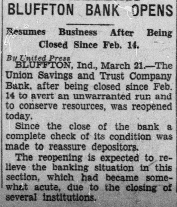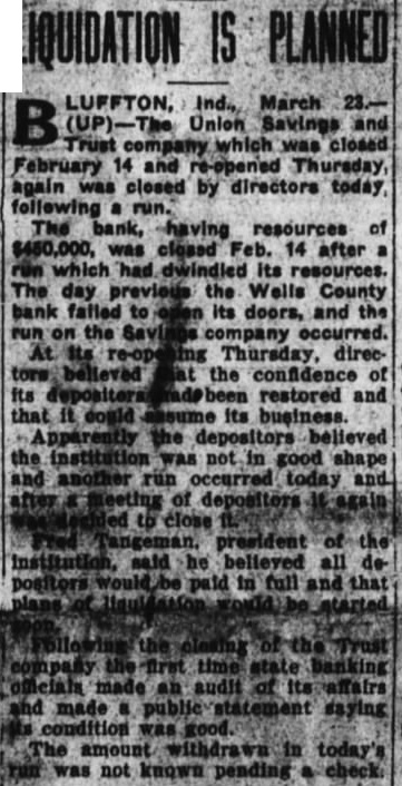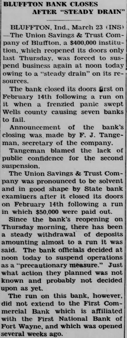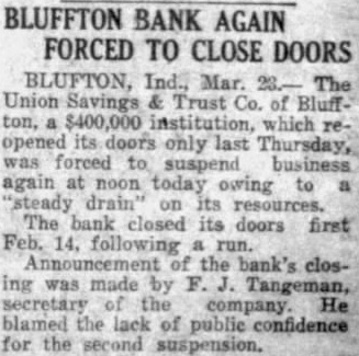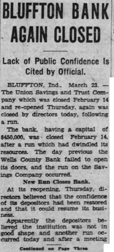 BLUFFTON, Ind., March The Union Savings and Trust Company which was closed February 14 and re-opened Thursday, again was closed by directors today, following run. The bank, having capital of $450,000, was closed February 14, after run which had dwindled its resources. The day previous the Wells County Bank failed to open its doors, and the run on the Savings Company occurred. New Run Closes Bank. At its reopening, Thursday, directors believed that the confidence its depositors had been restored and that it could resume its busiApparently the depositors believed the institution was not good shape and another run curred today and after meeting