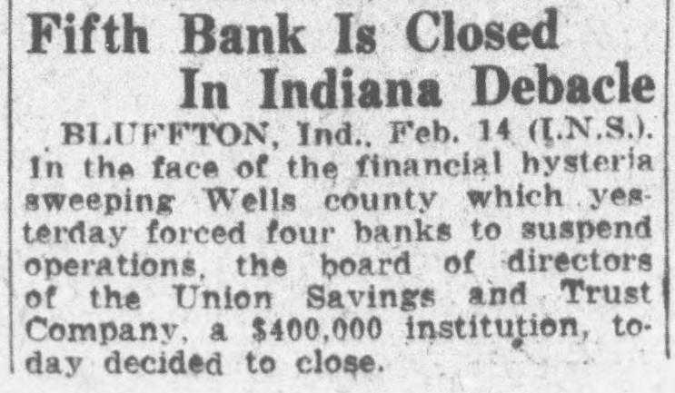 Fifth Bank Is Closed In Indiana Debacle BLUFFTON, Ind., Feb. 14 (I.N.S.). In the face of the financial hysteria sweeping Wells county which yesterday forced four banks to suspend operations, the board of directors of the Union Savings and Trust Company, a $400,000 institution, today decided to close.