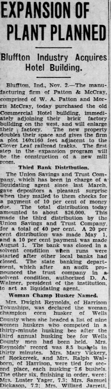 Bluffton. Ind., Nov. 2.-The manufacturing firm of Patton & McCray, comprised of W. A. Patton and Morris McCray, today purchased the old Commercial Hotel building. immediately adjoining their brick factory building on the west. and will enlarge their factory. The new property doubles their space and gives the firm a plot 140x160 feet adjacent to the Clover Leaf railroad tracks. The first step in the expansion program will be the construction of a new mill room.