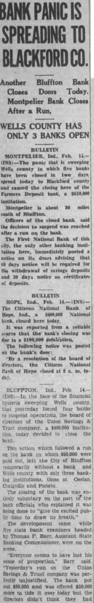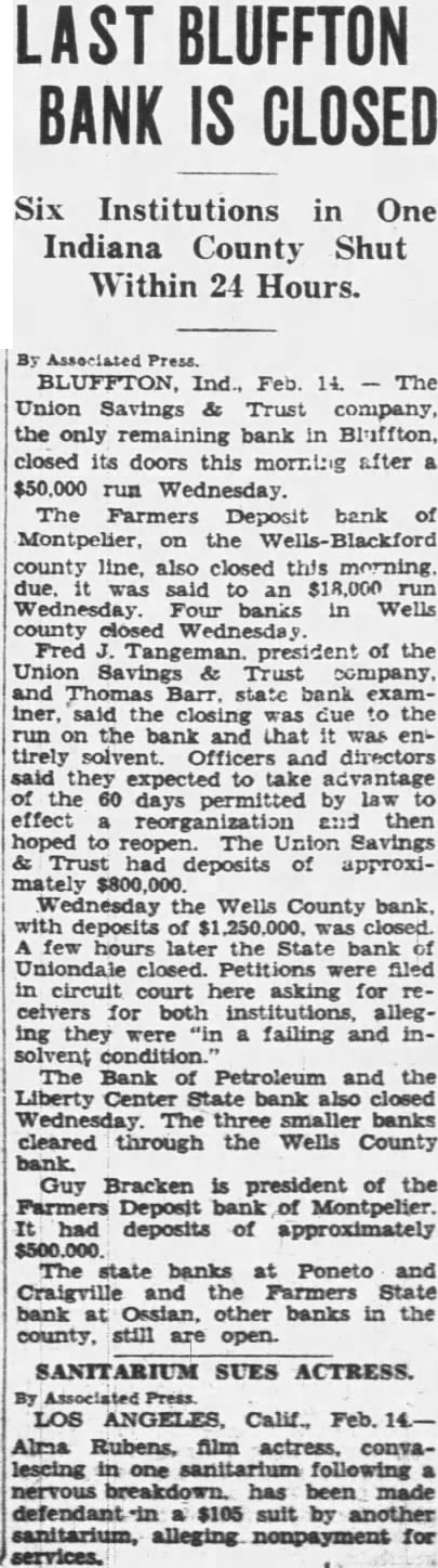 Associated BLUFFTON, Ind., Feb 14. The Union Savings & Trust company, the only remaining bank in Bluffton, closed its doors this morning after Wednesday. The Farmers Deposit bank of Montpelier, on the Wells-Blackford county line, also closed this morning. said to Wednesday. Four in Wells county closed Wednesday Fred president of the Union Savings Trust company, and Thomas state bank examiner, said the closing was due to the run on the bank and that was entirely solvent. Officers and directors said they expected to the 60 days permitted by effect and then hoped to reopen. The Union Savings Trust had deposits of approxiWednesday the Wells County bank, with deposits of closed. few hours later the bank Uniondale closed. Petitions were filed in circuit court here asking for ceivers for both institutions, alleging they were failing and insolvent condition. The Bank Petroleum and the Liberty Center State bank also closed Wednesday. The smaller banks cleared through the Wells County Guy Bracken is president of the Farmers Deposit of Montpelier. had deposits of approximately The state banks at Poneto and Craigville and the Farmers State bank Ossian, other banks in the county, still are open.
