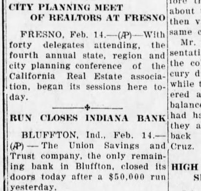 INTERNATIONAL NEWS SERVICE Ind., Feb. the face financial that terday pend operations, board of rectors of Union Savings Trust company, $400,000 today decided close the bank. This action run bank paid out, left the city of Bluffton bank and Wells county only three bank. ing those at Ossian, and The closing of the tirely voluntary the part the officials who explained being done to "give the expublic time draw its The development while state examiners headed by Thomas Barr, assistant state banking were on the seems have his proportion," Barr the Union Trust company was perfectThe bank put out and offered $50,000 tide but the directors didn't think they had better take The bank doesn't and solvent. that while the explained banking department didn't state Union Saving Trust close by company, its board of directors, had step Meanwhile the residents of Poneabout 300 to, miles Bluffton, sons 10 today Bank of only bank, Poneto, in the The said have withstood bank but after the business Cashier of the Mussellman called which held at mass the Poneto grade auditorium More than 125 school night. citizens attended. plea for support made every present the behind the bank. promised citizens were disWhile excited closing the last cussing the state bankBluffton bank today, examiners here force, ing charge of the closed Applications filed tutions. Judge W. Circuit for the Wells for receivers Bank of and County Bank Uniondale. the date for the February 21st hearing. was filed application also An officials of the court by the which prifor of liquidate the bank's trustee to affairs. Center Bank at LibThe Liberty erty fully sol- his Barr, received vent by close to avoid the frenzy of the depositors. the Barr, however, Wells county today situation in result of situation the the hope Barr over. that the