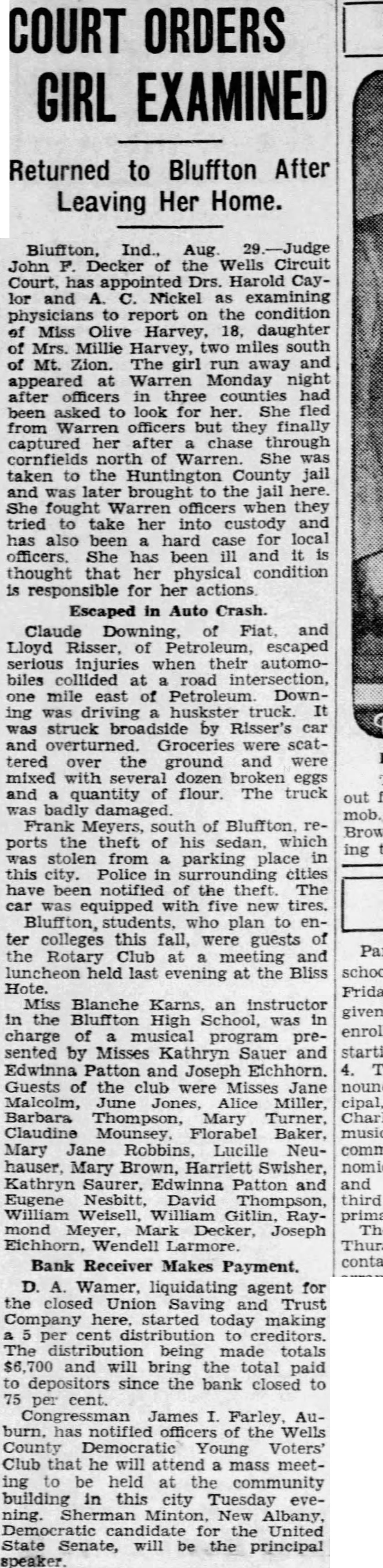 COURT ORDERS GIRL EXAMINED Returned to Bluffton After Leaving Her Home. Bluffton, Ind., Aug John Decker of the Wells Circuit Court. has appointed Drs. Harold Cayand Nickel examining report on the condition physicians Miss Olive Harvey, daughter Millie Harvey, two miles south Mt. Zion. The girl run away and appeared Monday night three had asked to look for She fled from officers but finally captured after chase through cornfields north of She taken to the Huntington County was later brought the jail here. fought Warren officers when they tried take her into custody and has also been hard case for local officers. She has been and thought that her physical condition responsible for her actions Escaped in Auto Crash. Claude of Fiat and Lloyd Risser. of Petroleum, escaped serious injuries when their automobiles collided at road intersection, mile east of Petroleum Downing driving truck. struck by Risser's car and overturned. Groceries were scattered over the ground and were mixed with several dozen broken eggs and quantity flour. The truck out badly mob. Frank Meyers, south of reBrown, ports theft of his sedan, which ing was stolen from parking place in this city. Police in surrounding cities notified the theft. The equipped with tires. plan to ter colleges this fall, were guests of the Rotary Club at and held last evening at the Bliss Hote. Miss Blanche Karns. an instructor given in the Bluffton High School, was in charge of musical program presented by Misses Kathryn Sauer Edwinna Patton and Joseph Eichhorn. Guests of the club were Misses Jane Malcolm, June Jones, Alice Miller, cipal, Barbara Thompson, Mary Claudine Florabel music, Mary Jane Robbins. Lucille Neuhauser. Mary Brown. Harriett Swisher. Kathryn Saurer, Edwinna Patton and Eugene David third William Weisell, William Gitlin. Raymond Meyer, Mark Decker, Joseph Wendell Bank Receiver Makes Payment. Wamer, liquidating agent for the closed Union Saving Trust Company here. started today making cent distribution creditors. distribution being made totals and will bring total paid depositors since the bank closed to cent. Congressman James Farley Auhas notified of the Wells Young Voters' Club that he will attend mass meeting be held at the community building in this city Tuesday evening. New Albany, for the United State Senate, will the principal speaker.