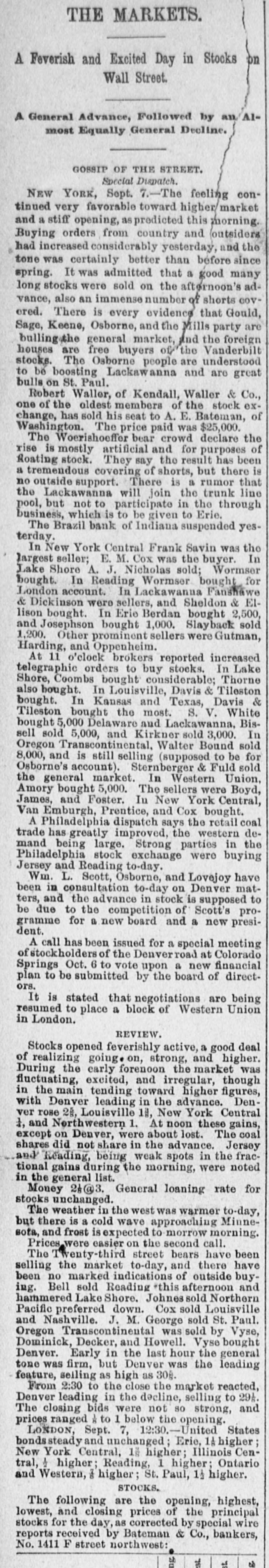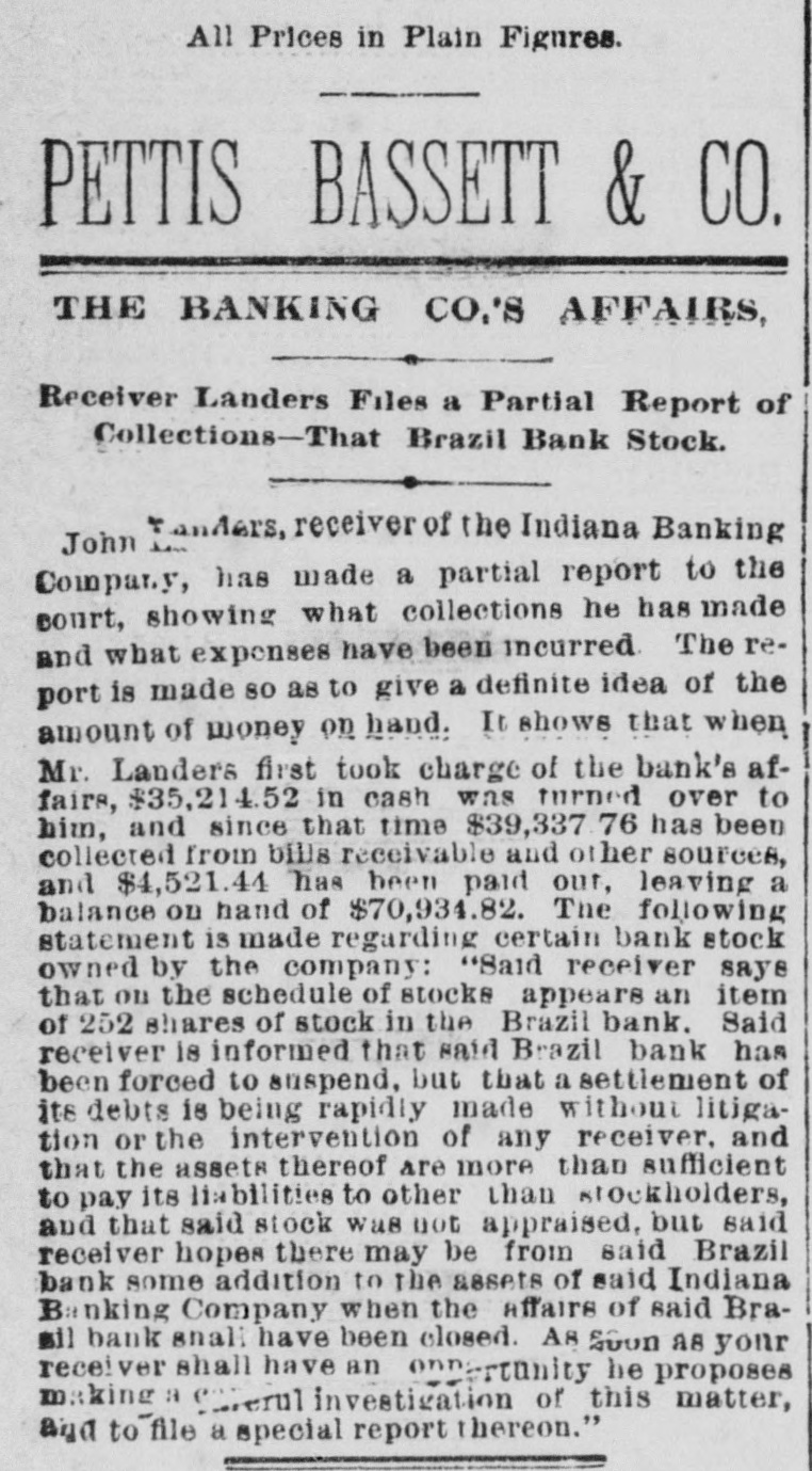 Minor Notes. The city council of Rising Situ have awarded the contract for building an iron bridge across Dry branch. Captain Lexington Wolfe, a well-known New Albany river man, died on Tuesday evening after a lingering illness. A Terre Haute man took the money given him by his neighbors on Tuesday night to bury his dead baby, and got drunk on it. Among the county newspapers of southern Indiana none have improved more rapidly than the Salem Press in the past two or three months. Nancy Hinkle, about eighteen years of age, committed suicide by taking morphine, at the residence of Mrs. Partmann, at Peru. She leaves a babe. Mr. Tip Kerr, of Raccoon township, Parke county, sold yesterday eighty-two head of hogs that averaged 386 pounds. They were shipped to Indianapolis. The second day of the fair at Aurora, on Wednesday, was a success. The attendance was 8,000. and premiums were awarded in the various departments. Purdne University opened its fall term yesterday, under the administration of President J. H. Smart. There is increased attendance, and the term opens most favorably. At Bedford. on Tuesday night. at the depot of the L., N. A. & C. road, a brakeman, while coupling, was caught between the cars and crushed to such an extent that ne died before reaching Salem. The farmers of Delaware county report that a great deal of the Kansas corn planted last spring will be too late to properly rig U. It is feared that the greater part will be only valuable for fodder. The man struck by Dave Kurts, at Otterbein. was not killed, but knocked out of time-an hour's time. He was the instigator of the affray and only got his deserts, as did a pal who rushed to his assistance. While George McFerren, of Huntington, was examining a revolver on Tuesday night, he shot and instantly killed Tightman Heiney. Heiney was exhibiting the weapon to his friends, and McFerren supposed it was not loaded. Abraham Love, one of the oldest citizens of Jack. son county. died at his residence. on Chestnut Ridge, on Wednesday night. Deceased came from Tennessee in early times, having purchased the land upon which he lived from the government. John Scantlin was shot and killed by Elijah Craig at Otwell, Scantlin having bounced him in Boyd's saloon for going to see a girl in the Scantlin neighborhood. Craig is in the Petersburg jail, though it is probable that he will soon be released, as the shooting was in self-defense. Captain A. T. Bliss, of Lanorte, left, the latter part of July, to attend to some legal business in Nebraska. and has not yet returned. He was seen at Pueblo, Col., Aug. 14, but since that time nothing has been heard of him, and his friends are alarmed. He has a number of cases for trial in the circuit court, now in session, awaiting his appearance. The Brazil Bank has suspended payment. The Indiana Banking Company was a heavy stockholder in it, and since the failure of the latter there has been a steady drain on the bank until about $90,000 to $100,000 on deposit has been drawn out. Liabilities, $76,000; assets, $100,000. The general impression is that the bank will be allowed to wind up without litigation. A post of the G. A. R., to be known as Gar. field Post, No. 254, was organized at Uniontown, Vernon township, Jackson county. on Wednesday night. Following are the officers: William Marion Brooks, P. C.; D. B. Bedel, S. O. C.; Edward Lester, J. O. C.: A. J. Robinson, O. D.; W. H. Thomas, O. G.; James W. Bedel, chaplain; T. S. Bard, surgeon; W. M. Robins, quartermaster: I. H. Johnson, adjutant.