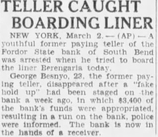 TELLER CAUGHT BOARDING LINER NEW YORK, March 2 youthful former teller of the bank South Bend when he tried to board Berengaria today George the former paydisappeared after "fake hold been the bank week in which 400 of the were resulting in on the police were The bank now in hands of receiver